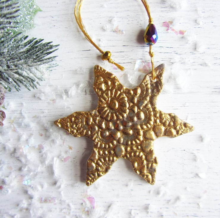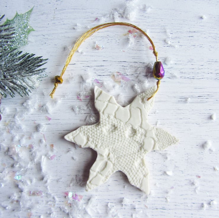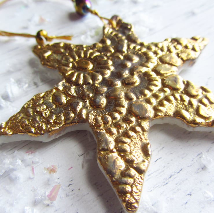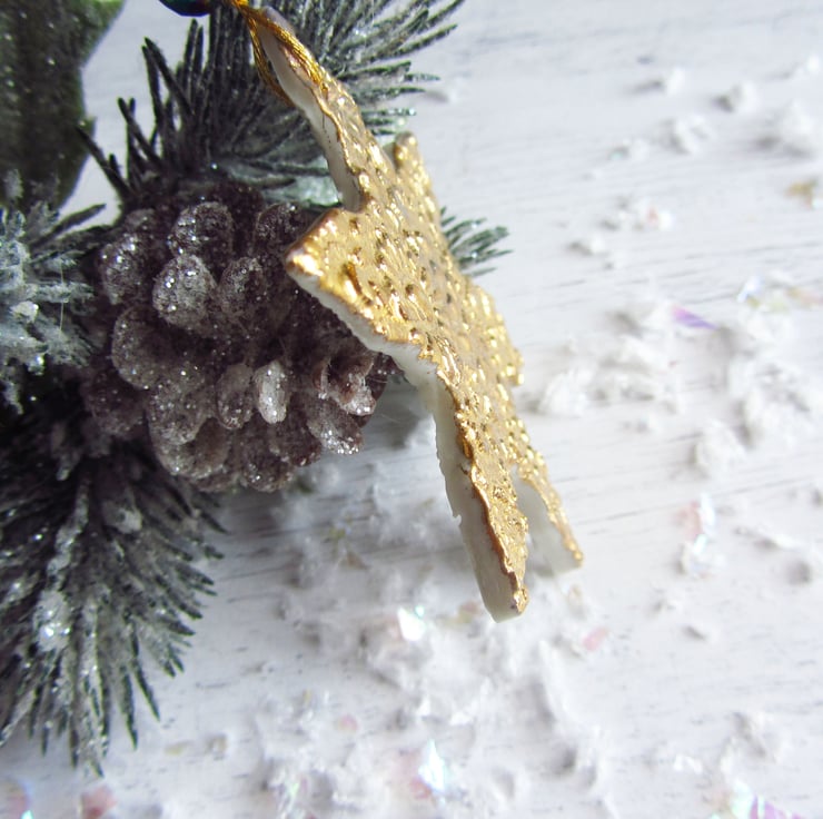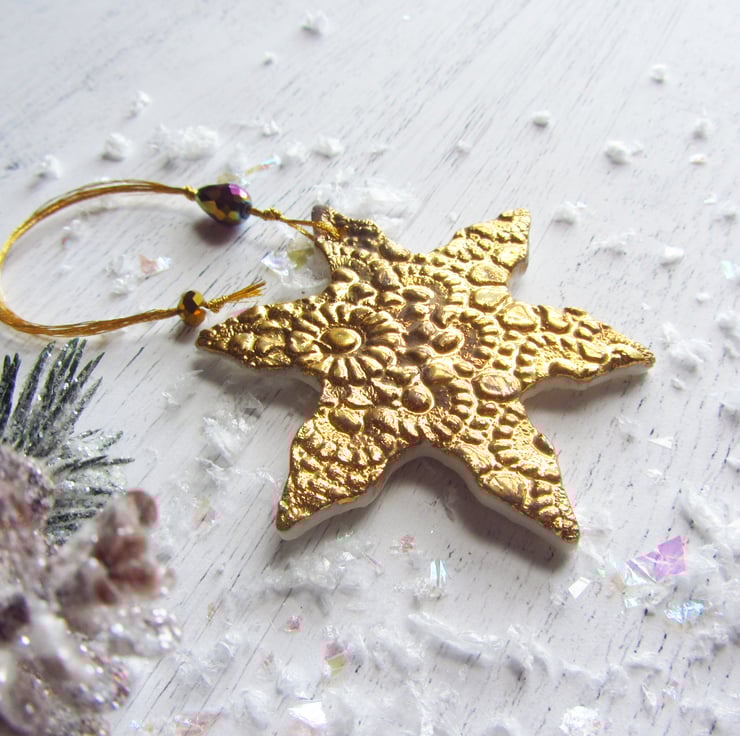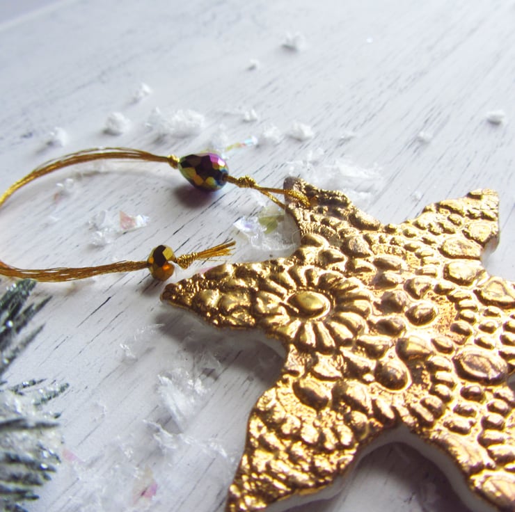 A porcelain snowflake that has lace patterns on both sides imprinted, before going through its first firing. It is then glazed, and has its second firing. Finally, each decoration is hand painted with 22ct gold lustre to give a golden finish and goes through a third and final firing. Each decoration is threaded with sparkly thread so it looks pretty on the tree. There are two beads, and you can choose whether you would like the smaller bead lower by the snowflake, or located on the branch.