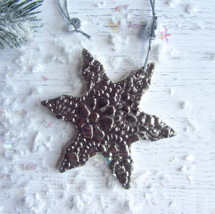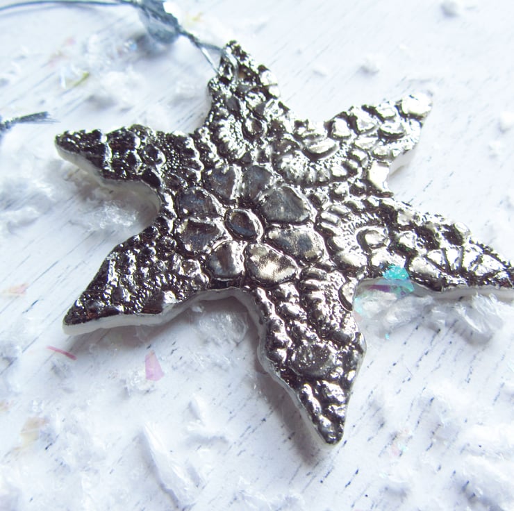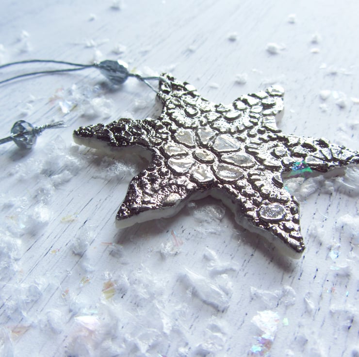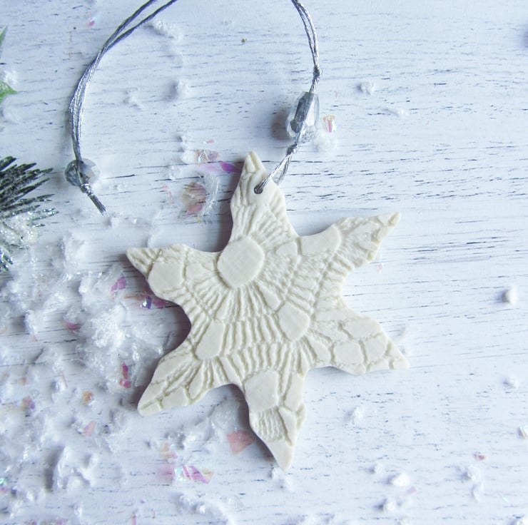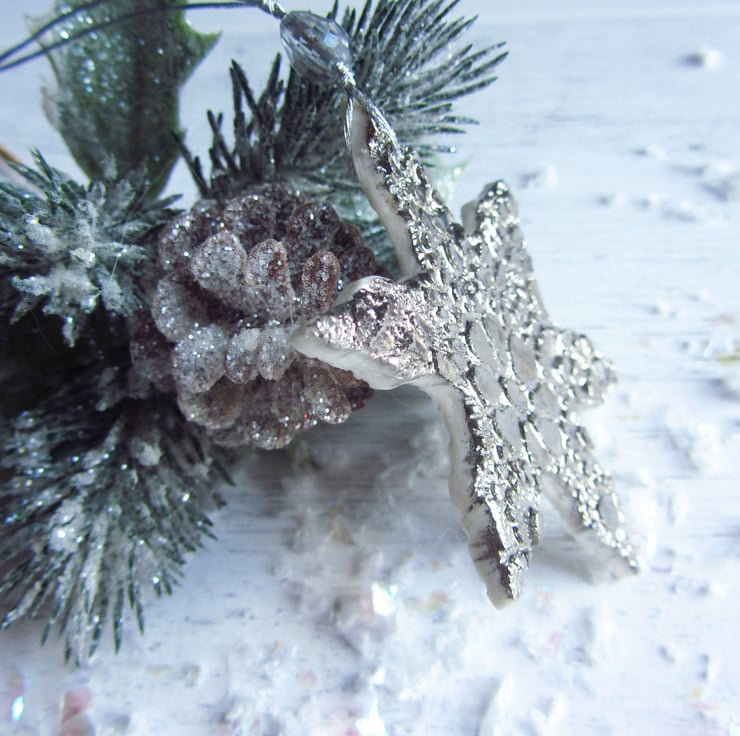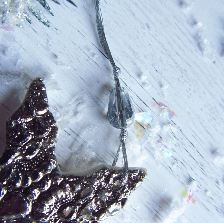 A porcelain snowflake that has lace patterns imprinted on both sides , before going through its first firing. It is then glazed with a clear glaze, and has its second firing. Finally, each decoration is hand painted with platinum lustre to give a silvery finish and goes through a third and final firing. Each decoration is threaded with sparkly thread so it looks pretty on the tree. There are two beads, and you can choose whether you would like the smaller bead lower by the snowflake, or located on the branch.