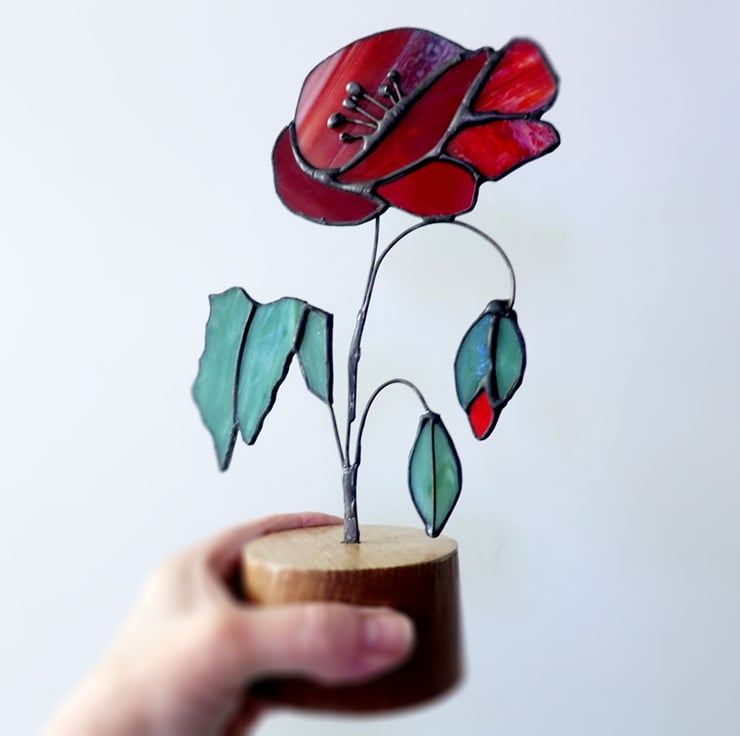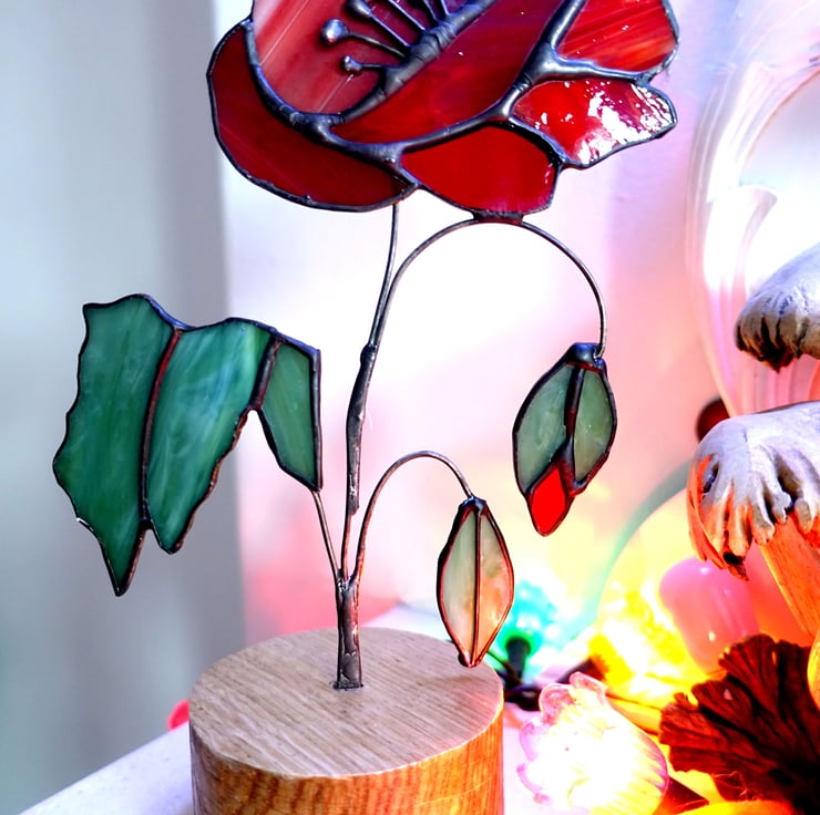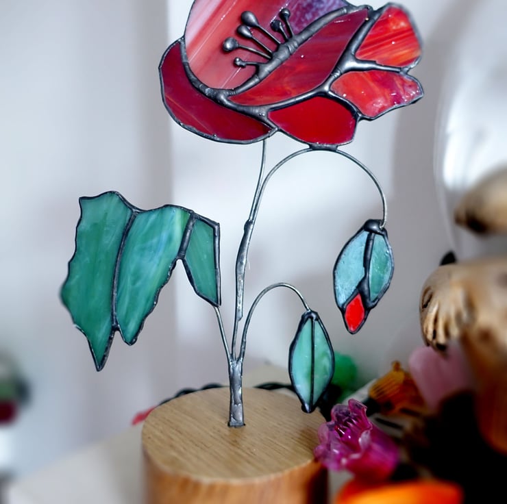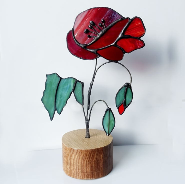 Stained Glass poppy made from stained glass standing on a plinth of solid hand turned Ash wood base with protective felt feet.
