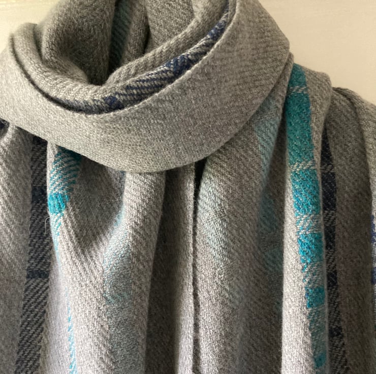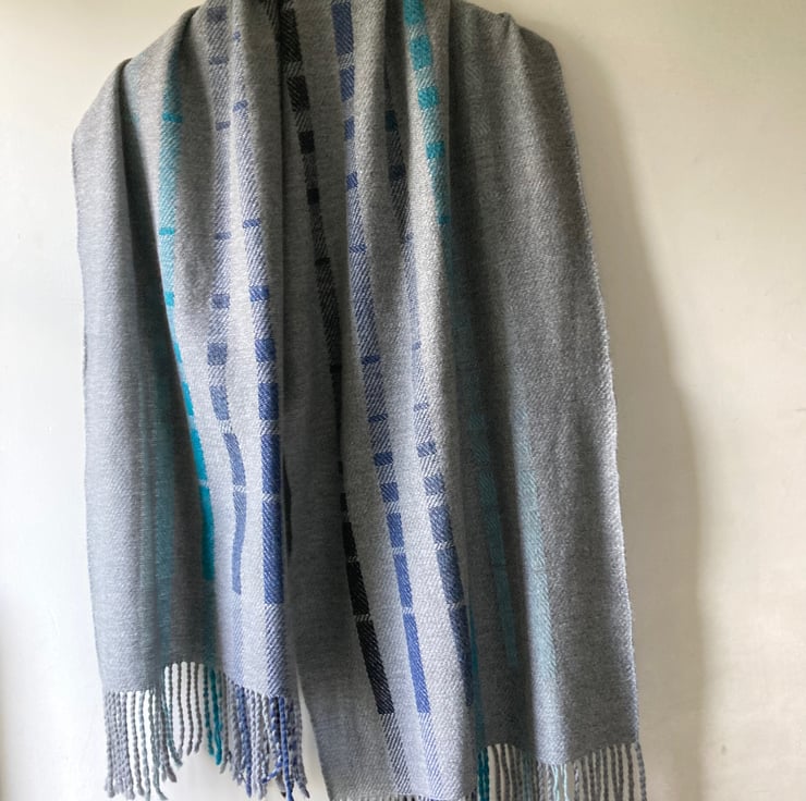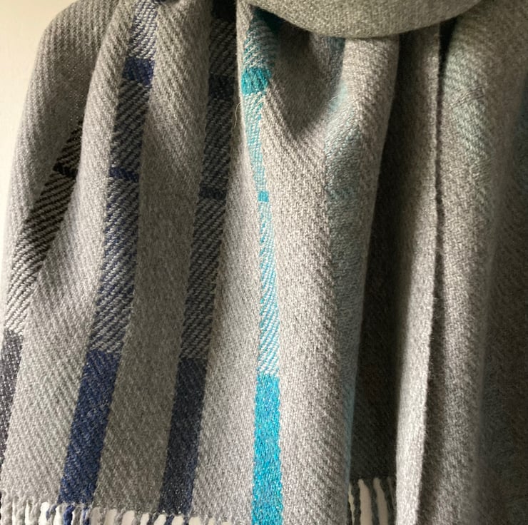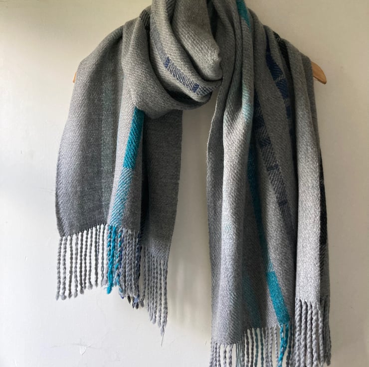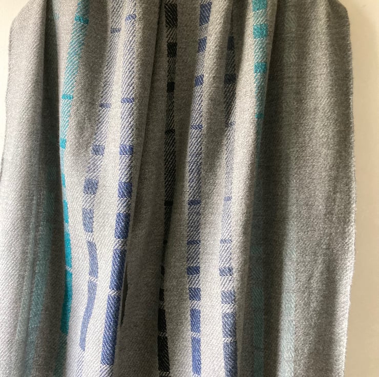 Hand woven from mill end fine merino lambswool in a block twill. The blocks vary in size to give a sense of movement, as the blues shift through the depths. Very soft and light with a superb drape.