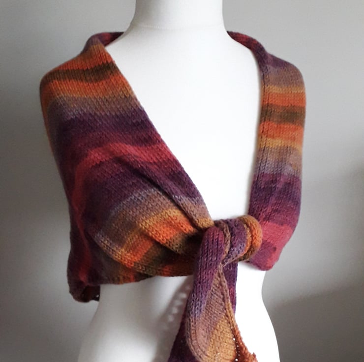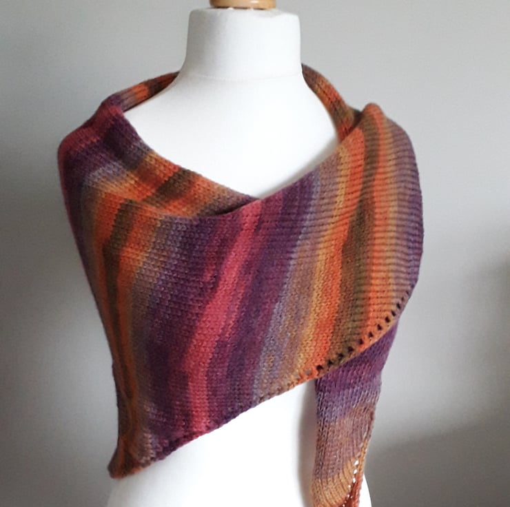 This triangular shawl has been lovingly knitted on a hand operated knitting machine and features pretty eyelets along two sides for a decorative finish.
