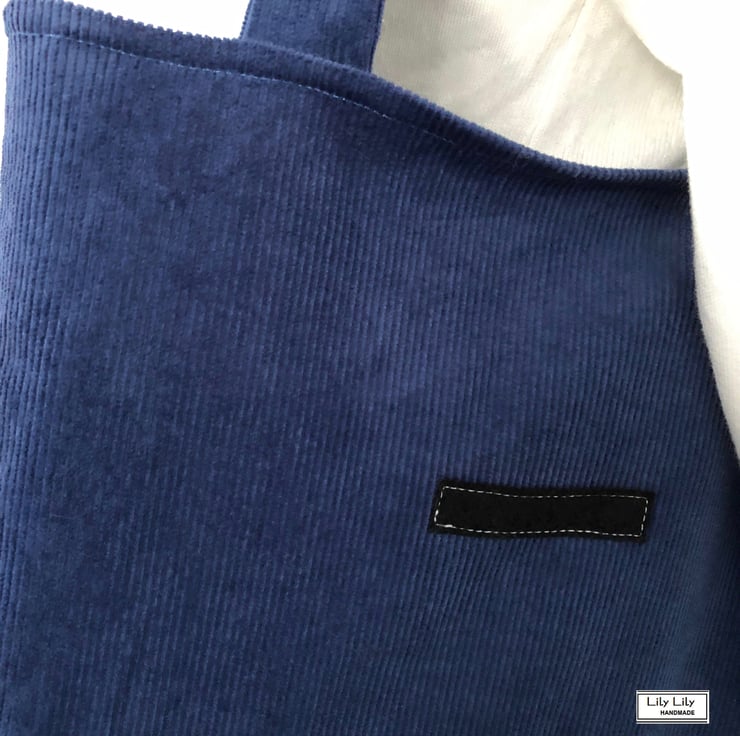 This listing is for a classic style and practical tote bag. The perfect sized bag for everyday use that has been sewn using a lovely blue coloured corduroy fabric (the colour is similar to a jeans blue). The bag has been overlocked with 4 threads for strength and durability. A small black motif (felt) has been seen on to the front of the bag for a little detail. The tote bag can be easily folded to be used when needed.