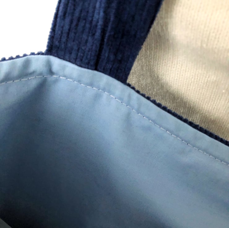 The book bag / tote bag is fully lined in a contrasting light blue coloured fabric.