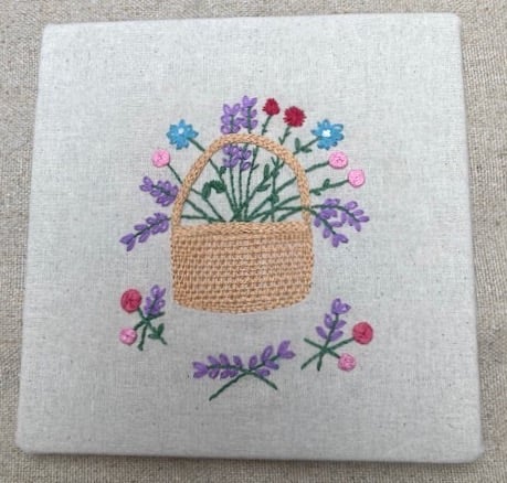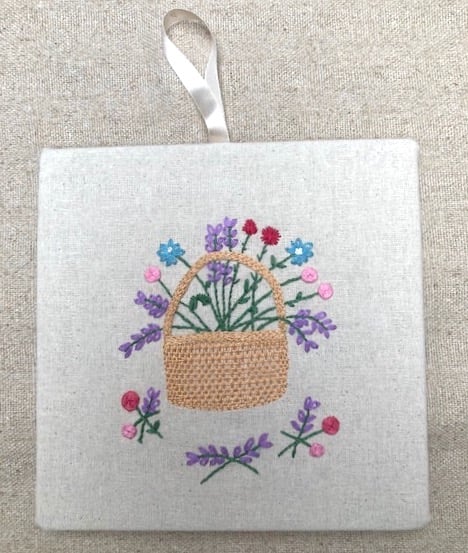 This charming basket of pretty flowers has been hand embroidered onto cream calico The calico is mounted onto mounting board 18cm x 18cm and backed with more calico. There is a small piece of cream ribbon attached to the back to hang up the picture up with. This would make a lovely gift for many occasions.