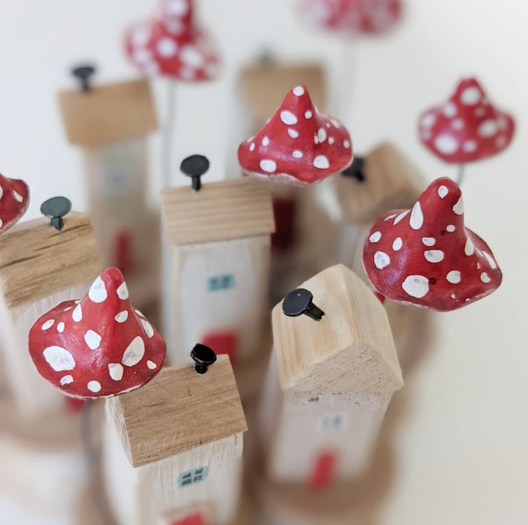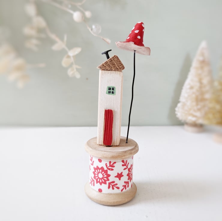 I love finding these old bobbins on rummaging trips! The tiny homes perch happily on top.