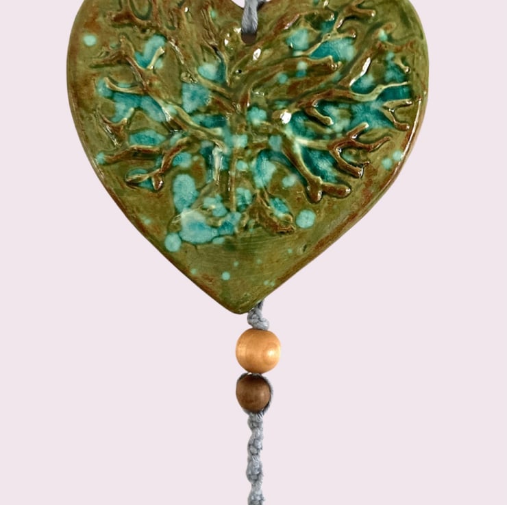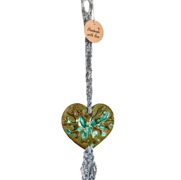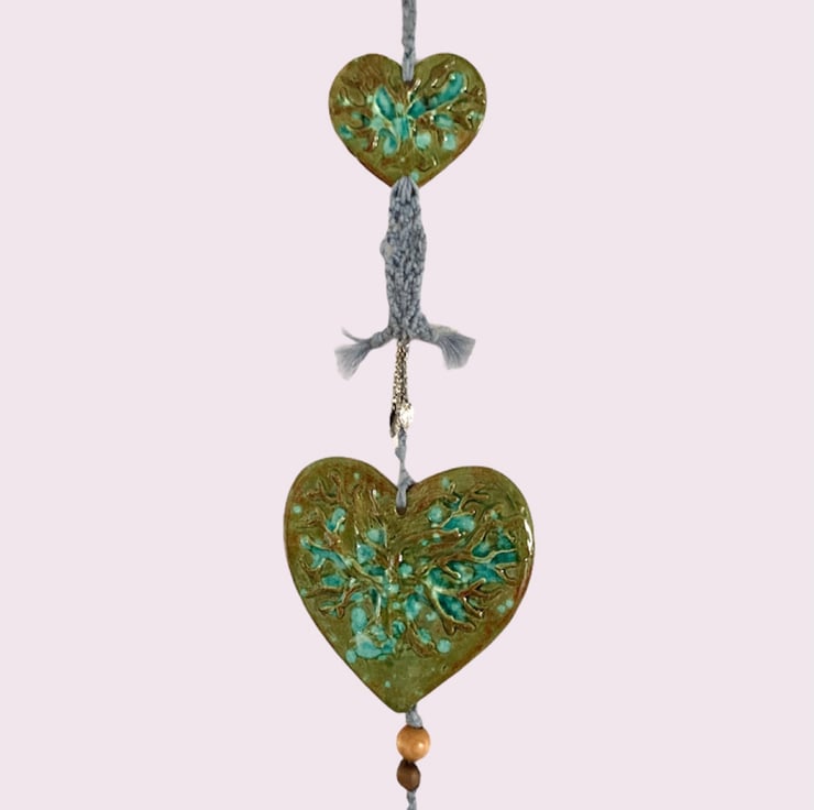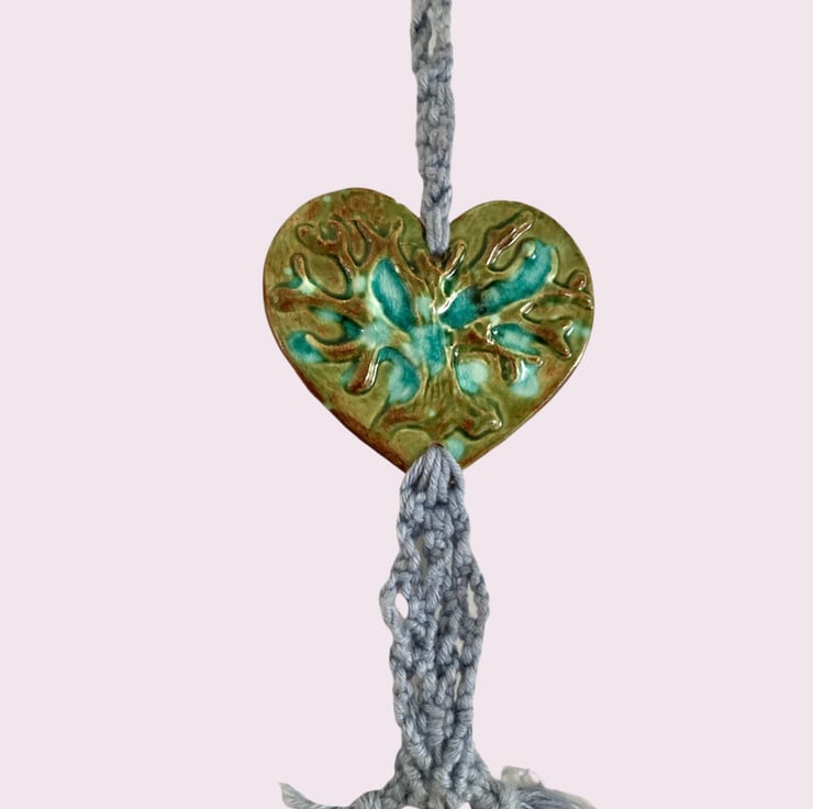 Handmade Ceramic heart shapes with tree if life design and green crystalline earthenware glaze, connected by macrame to make an attractive wall hanging.