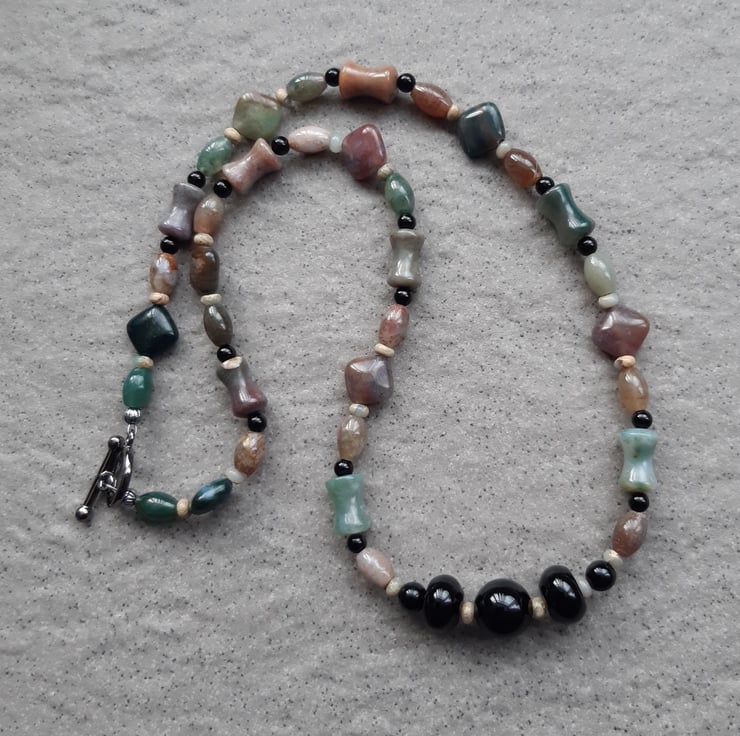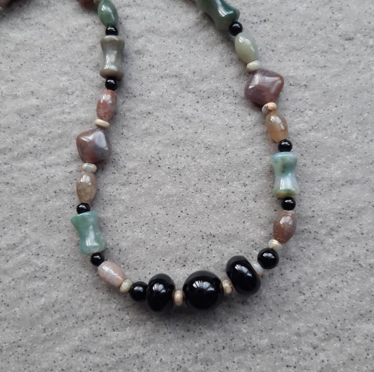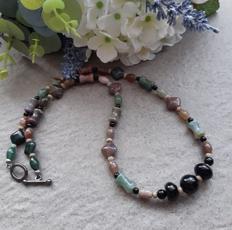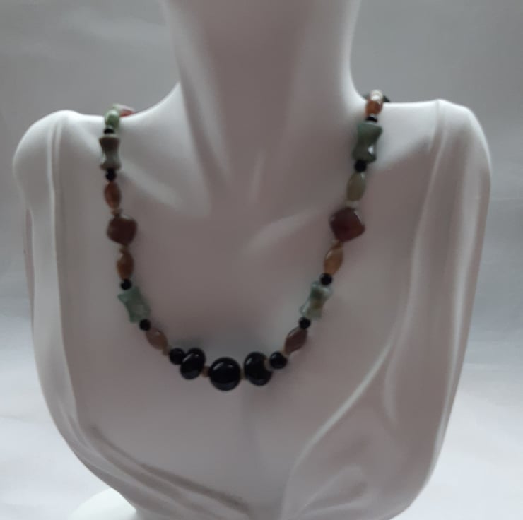 This necklace has been made with agate and small jasper semi precious gemstones.