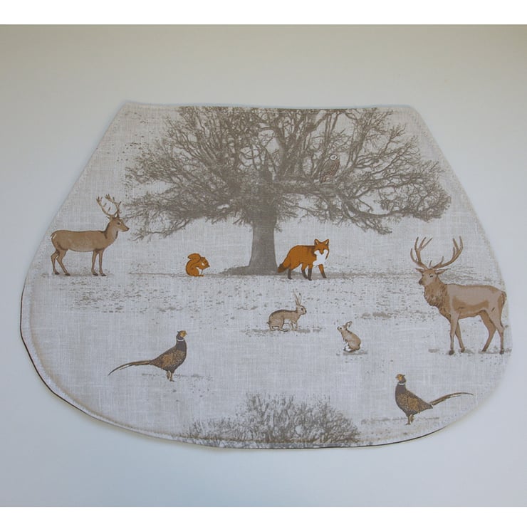 Woodland Scene featuring Stags, Fox, Squirrels, Rabbits, Pheasants, Owl - backed with a plain dark brown fabric.