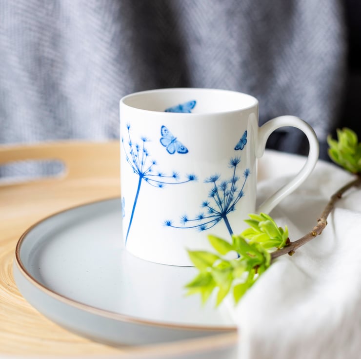 The delicate silhouettes of Cow Parsley seed heads with small blue butterflies fluttering around them are depicted on this pretty blue and white fine bone china mug. The design originates from my original Cyanotype creations inspired by the lovely delicate seed heads in the British hedgerows.