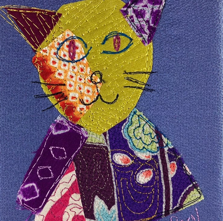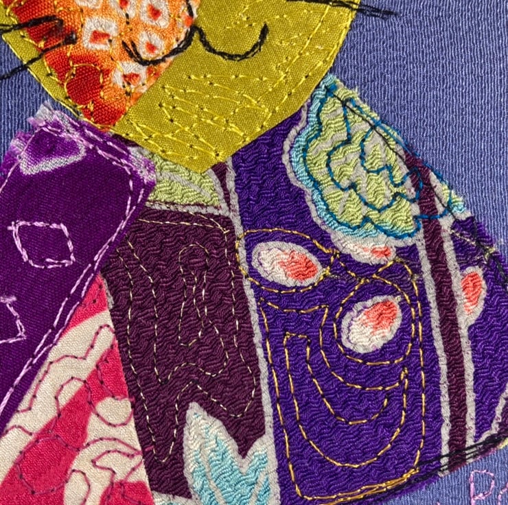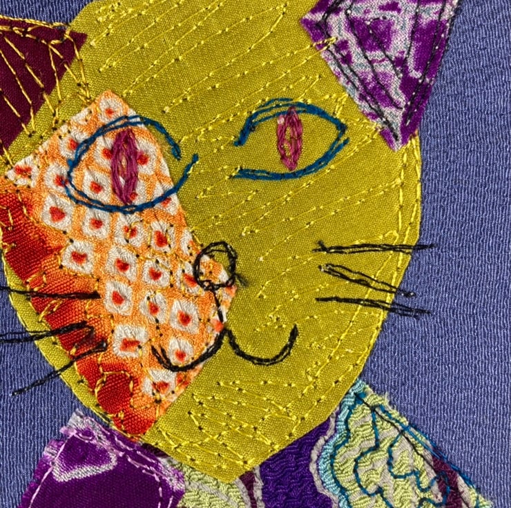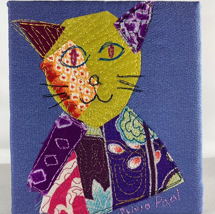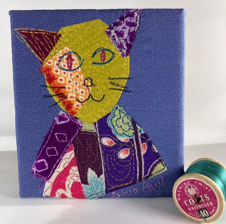This quirky cat is an original and unique item. It is made using kimono silk remnants and free motion machine embroidery. It is stretched over a wooden frame like a canvas, lined on the reverse and has a hanging loop. It measures 12 x 14 cm.