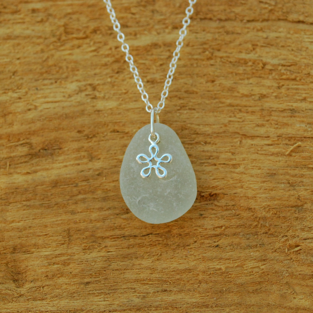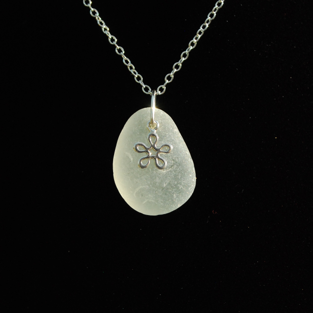 Sea glass has different types of frosting according to the type of beach it's been on. This piece of beautifully shaped sea glass has come from a rocky beach because the frosting is quite large and there are signs that the glass has been bashed on rocks. The glass is probably still intact because it was very thick when it was broken. In front of the glass is a pretty little sterling silver flower charm which shines nicely against the frosty glass.