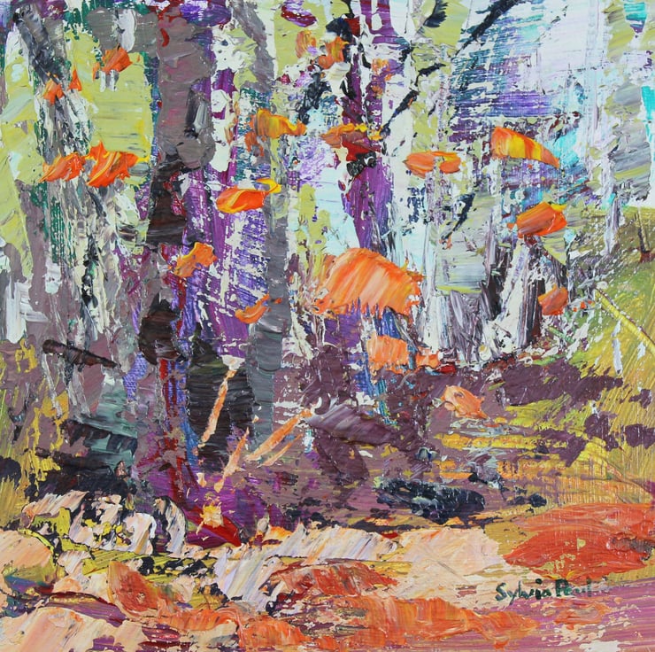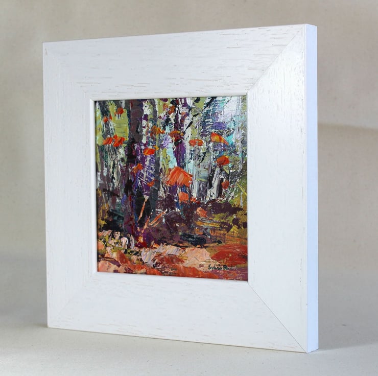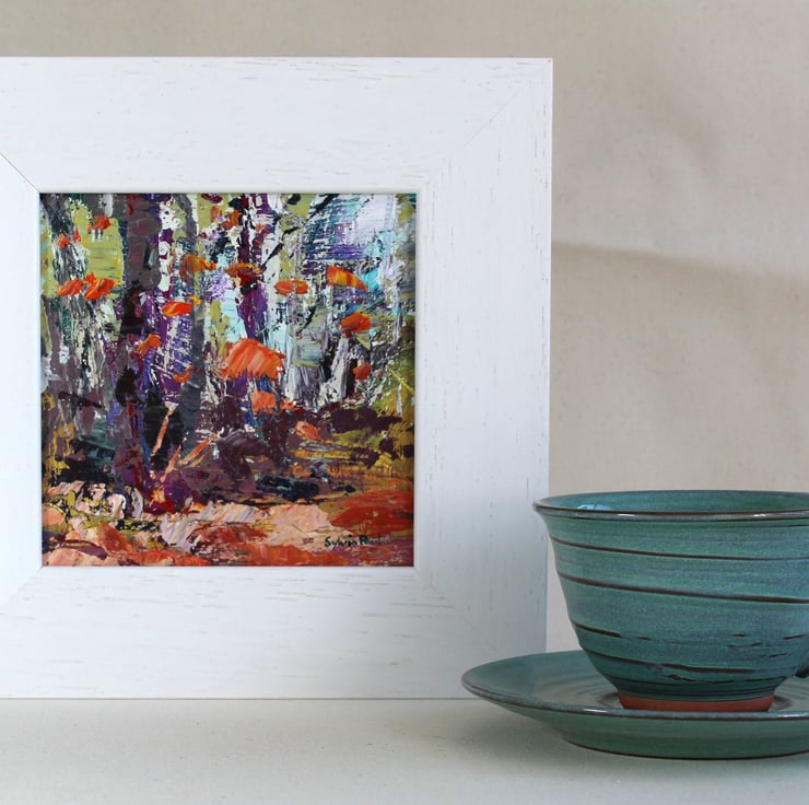 A framed original acrylic painting on board. Including the frame it measures 23 x 23 cm the board size is 15 x 15 cm. Working with a palette knife I use heavy body acrylics and work freely in an impressionist style. This is a lively expressive painting that would work well displayed on a shelf or on the wall with a group of small works.