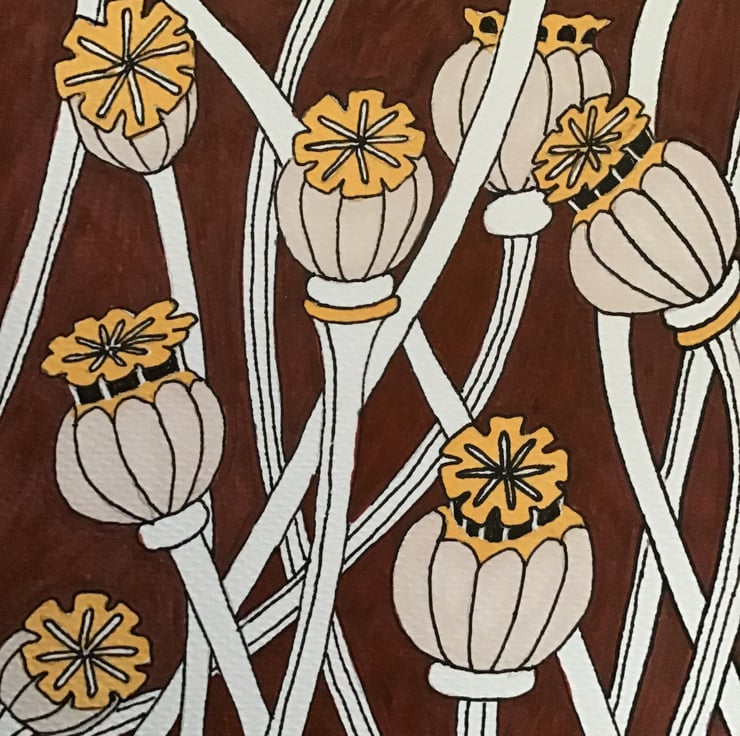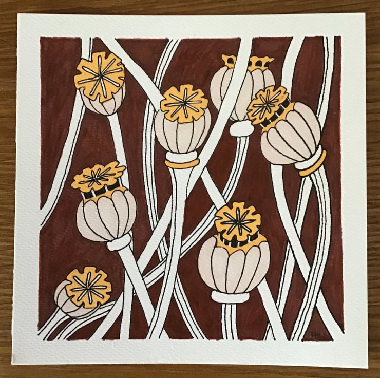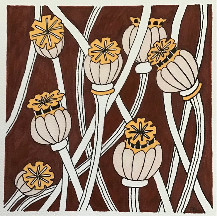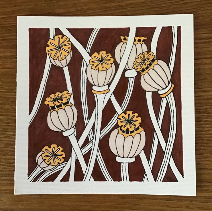 An original and unique drawing of poppy seed heads, drawn in a contemporary style using inks. Using earthy tones of rich shale brown and pale fawn, highlighted with white and sunshine gold, it is an autumnal interpretation of a bunch of dried poppy heads.