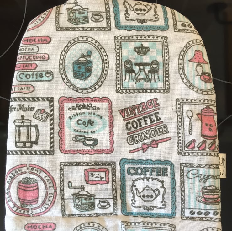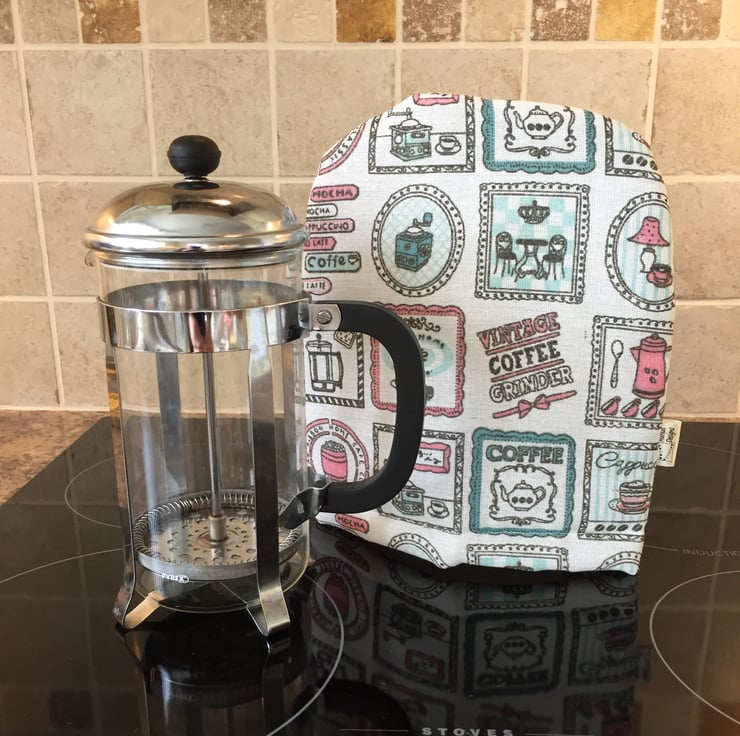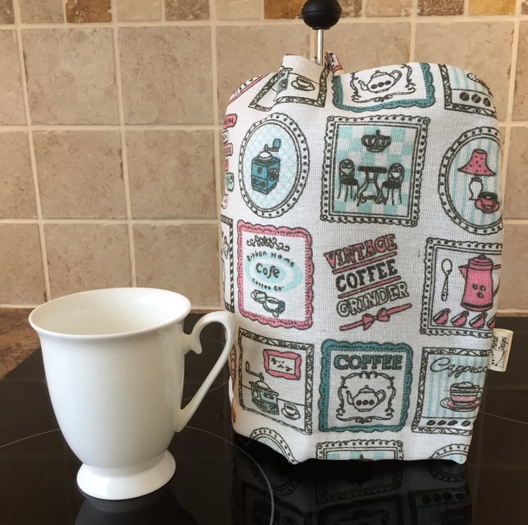 Your cafetiere will look gorgeous covered in this delightful Coffee inspired fabric and you will always have beautiful warm coffee to boot! Will cover a standard sized cafetiere. Due to pattern placement, the cafetiere cosy you receive may not be exactly the same as the one picture.