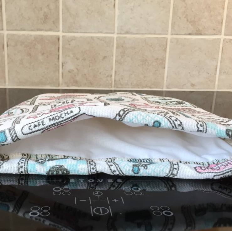 It is made from a 100% cotton outer and lined in white fabric with a layer of polyester wadding in between to keep your coffee nice and hot.