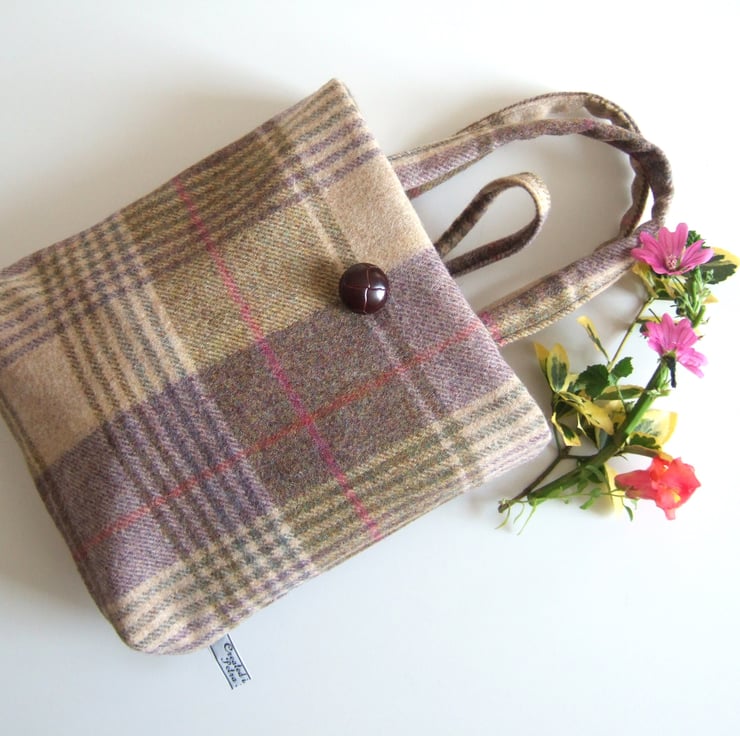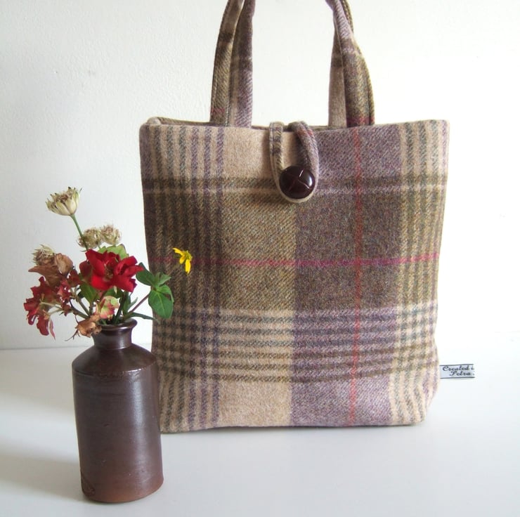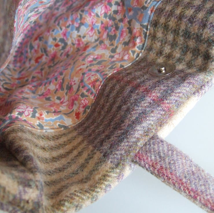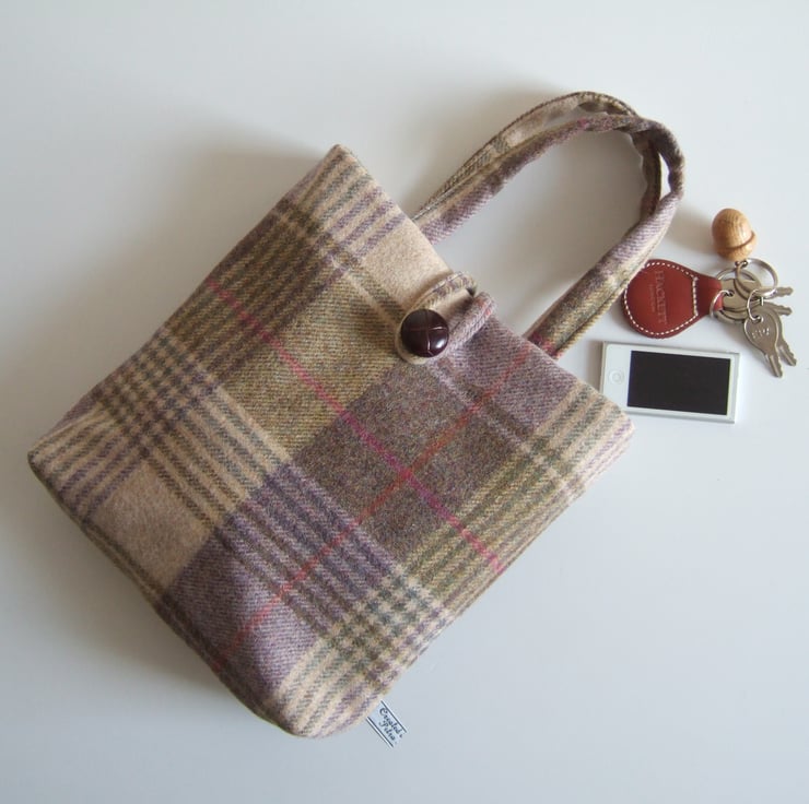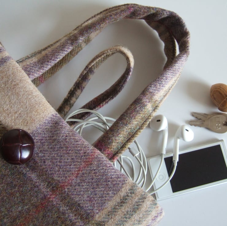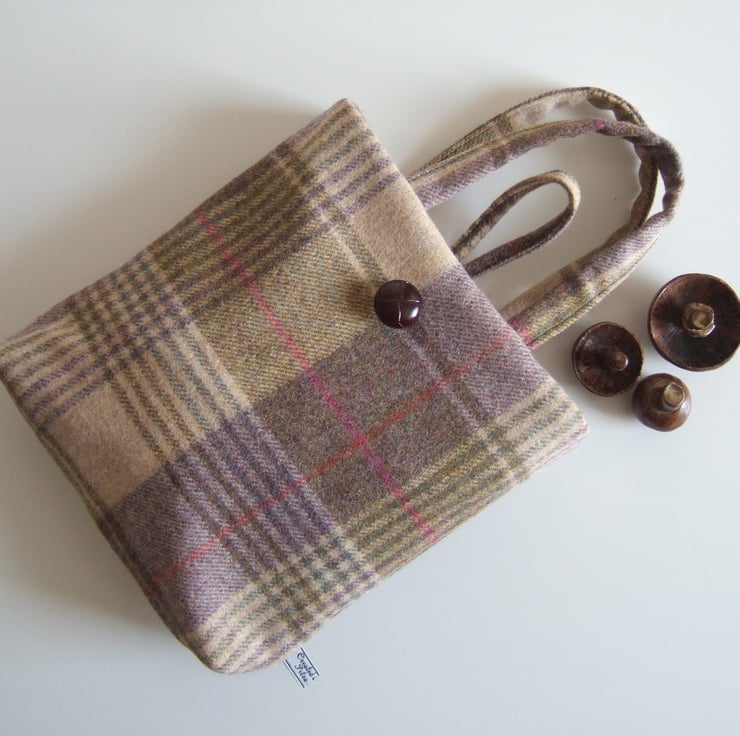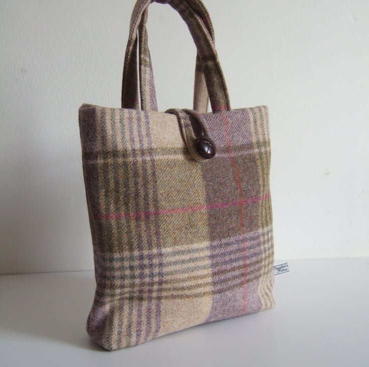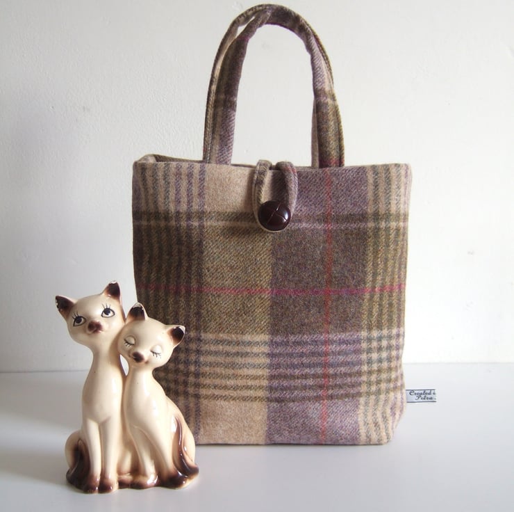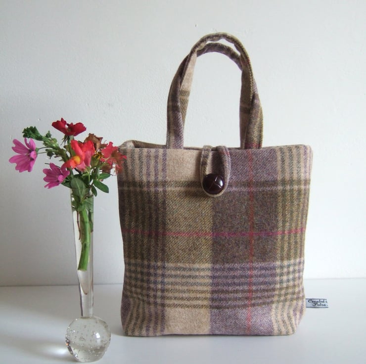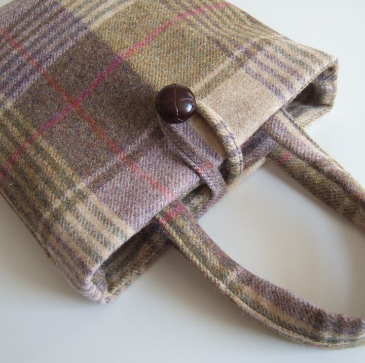 This lovely woollen remnant was just large enough to make a set of my little bucket bags. It is woven in a beautiful, muted, autumn winter colour scheme of olive green, lilac and beige. These simple bucket bags have a button and loop fastening, as well as a magnetic snap on the inside facing, and are like having an additional pocket, but with its own handles! Great little winter handbags, they make lovely winter birthday presents, best friend Christmas presents, or as a treat for yourself.