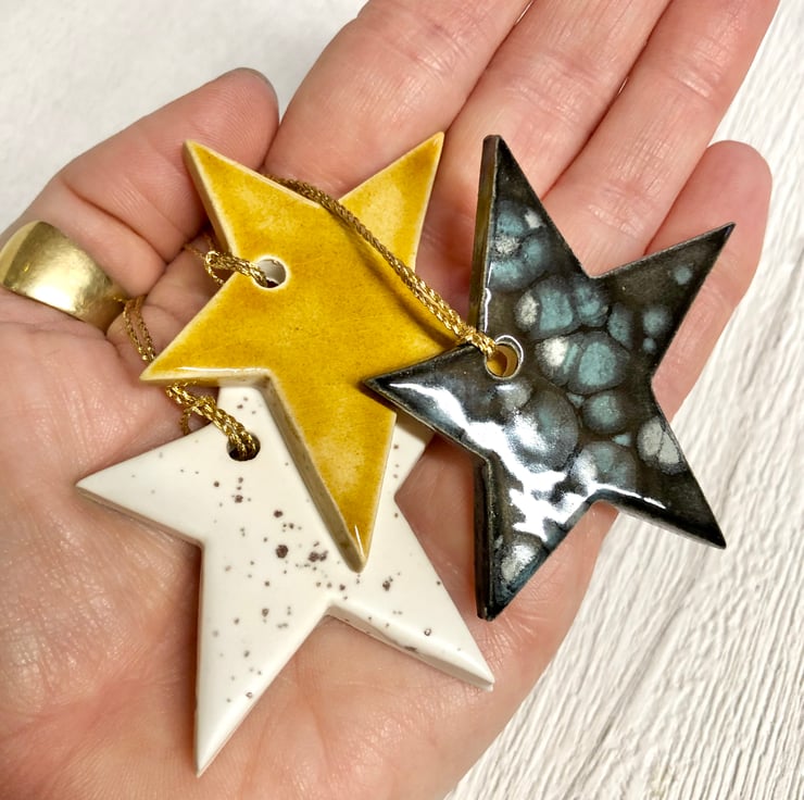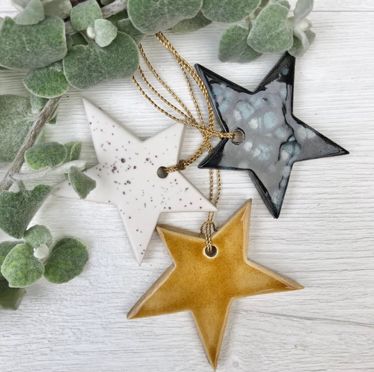 Three hanging ceramic stars made with white earthenware clay, glazed in a soft flecked white, rich autumnal amber and a crystalline midnight sky.