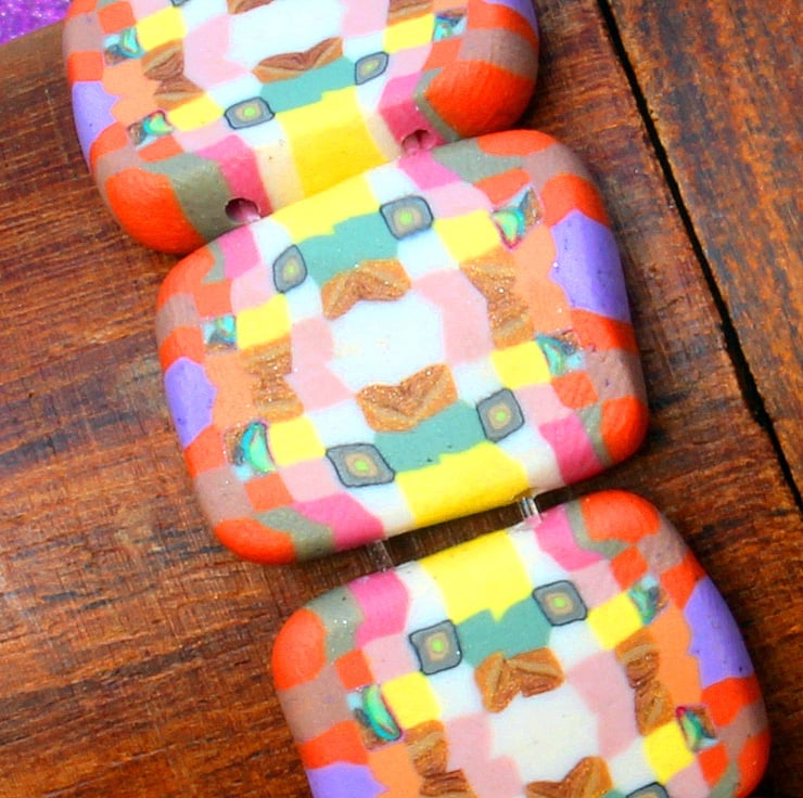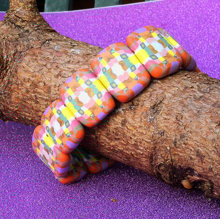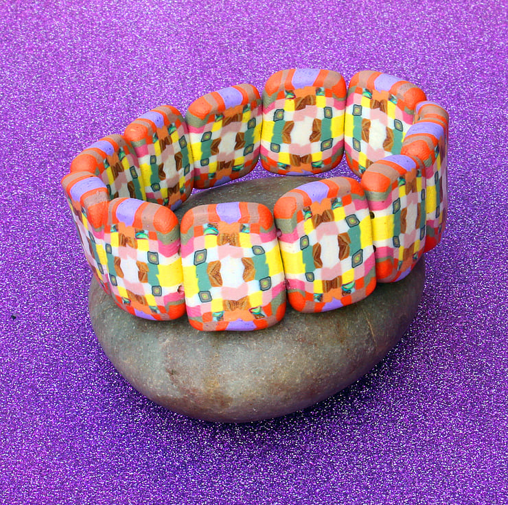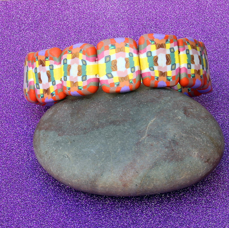 Captivating, delicately patterned beads of a geometric design make up this fascinating bracelet. The beads are hand crafted, by myself, from polymer clay (excellent, hard-wearing stuff that will keep it's colours forever). They are highly smoothed with a matt finish and have an authentic, mysterious appeal. They are linked together on two threads of unbreakable elastic. This is a one off, sample item that I am putting in the sale (There is nothing wrong with it ! ).