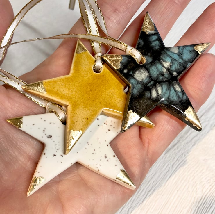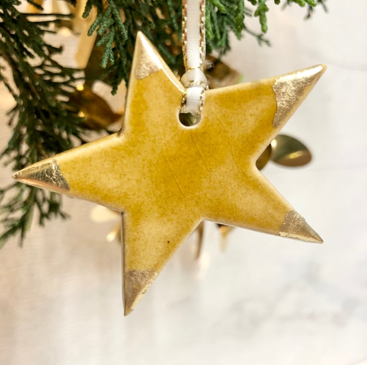 A hanging ceramic star made with white earthenware clay, glazed in a rich autumnal amber with genuine gold leaf tips, and finished with a soft gold ribbon.
