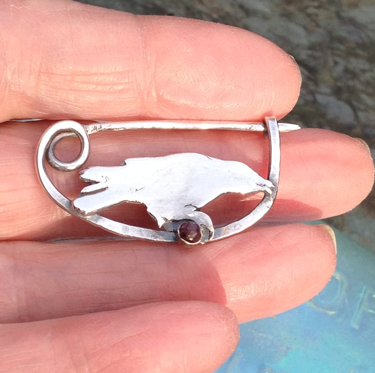 This listing is for one of these Thames crow brooches. Made in sterling and fine silver these brooches are in a familiar ancient style. Made from sterling silver wire with the fine silver crow attached each guarding a small dark red Thames garnet plucked from the foreshore.