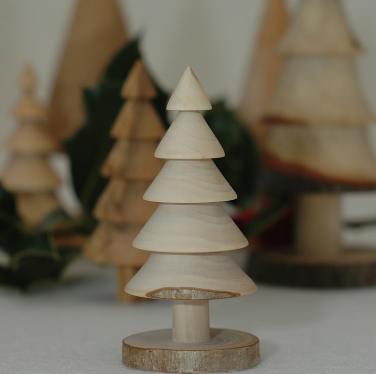 Small turned tree made from hazel branch wood. The tree is 9cm tall and I have kept some of the bark detail on the base, it is finished in my homemade beeswax and linseed oil balm. These look good grouped in odd numbers or with other designs and sizes of trees.
