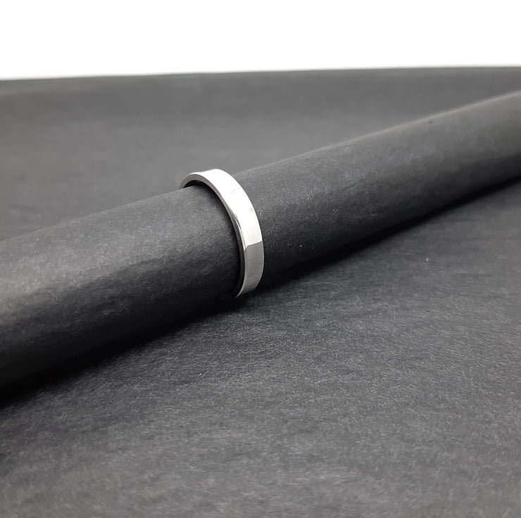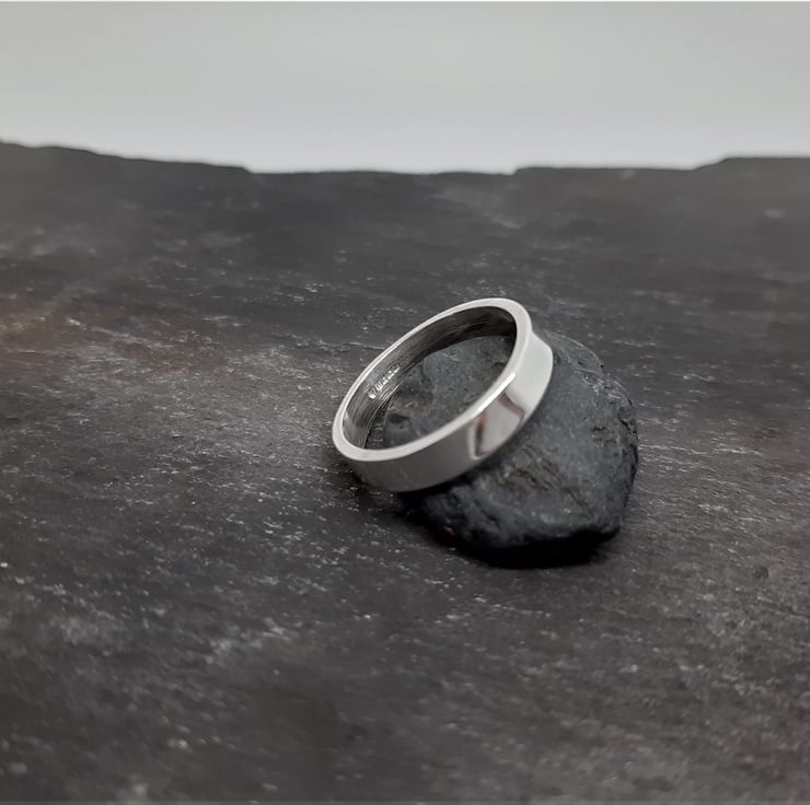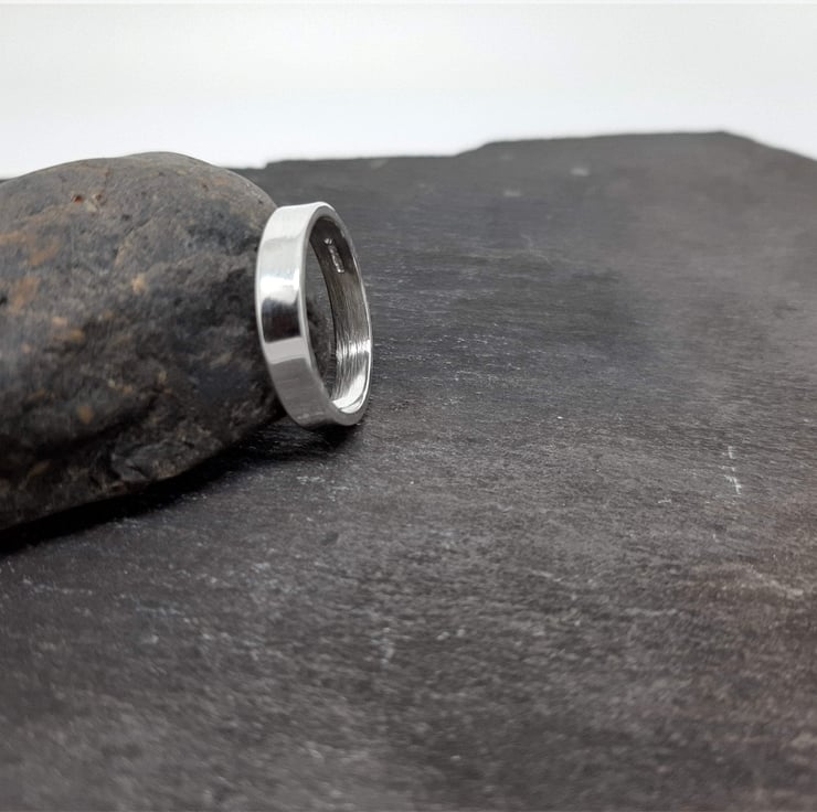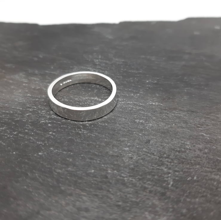 This ring has been made from 1.3mm thick sterling silver rectangular wire. The silver is cut, filed, shaped and soldered to make the ring. The finished ring is 4mm wide and given a high polish finish.