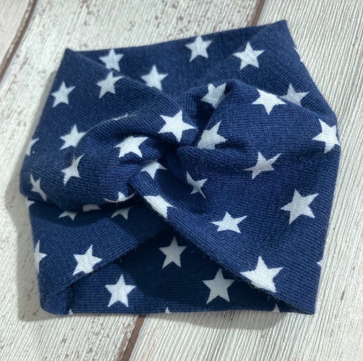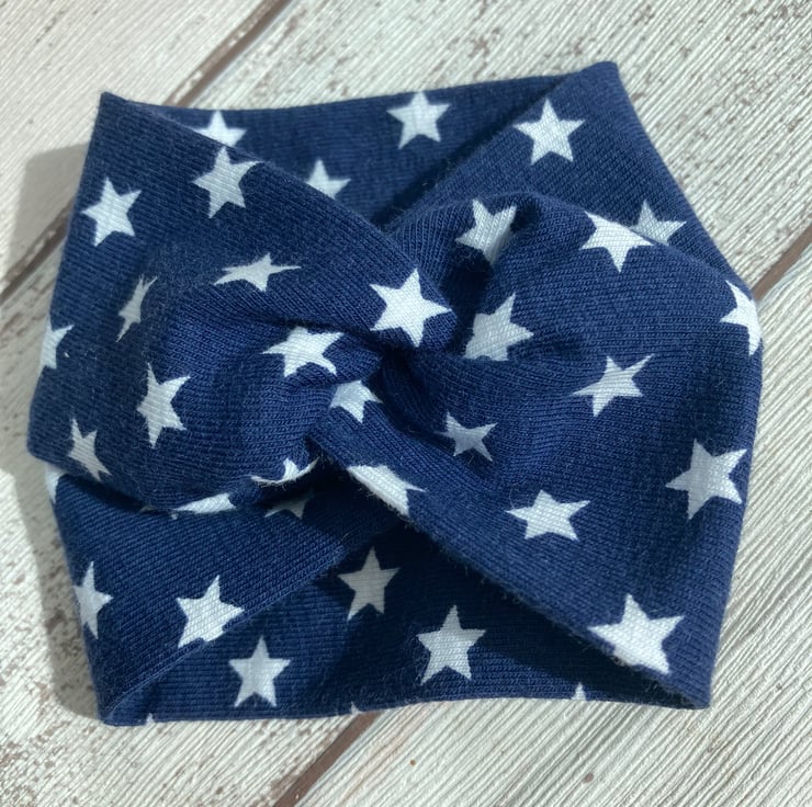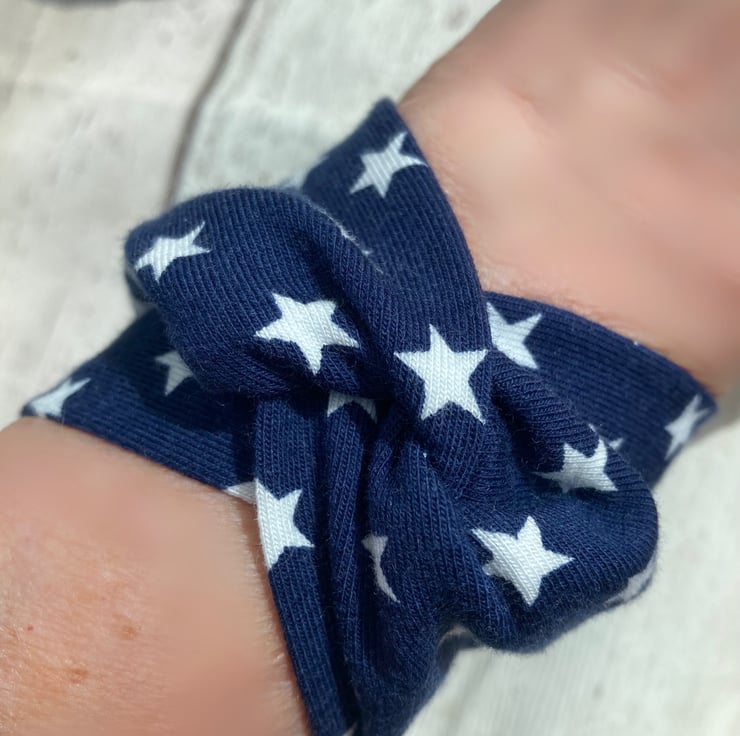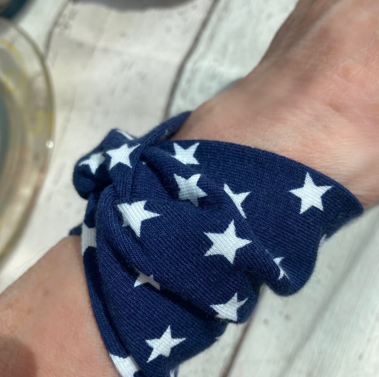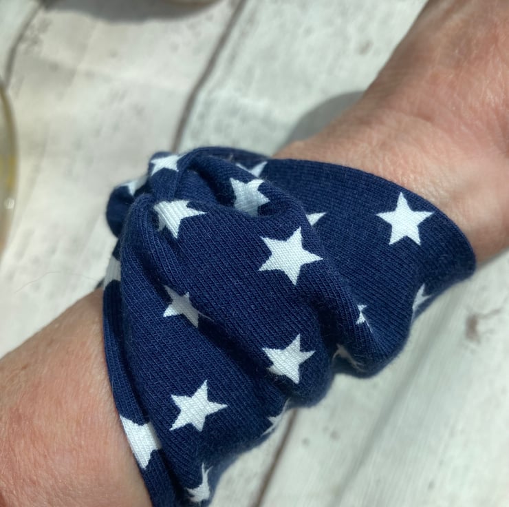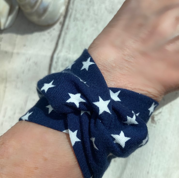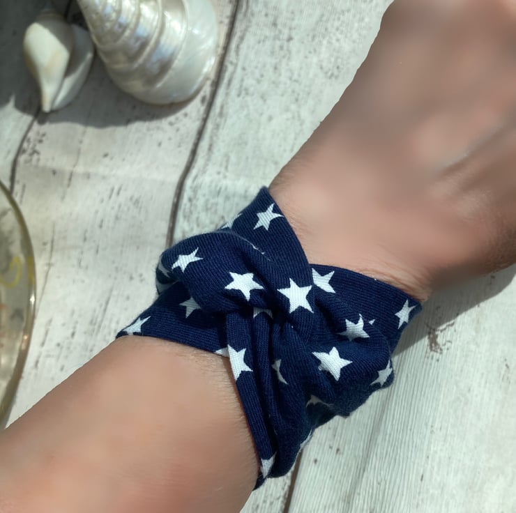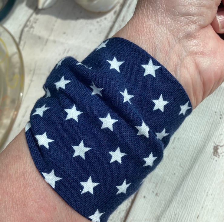 A great easy to wear wide cuff textile bracelet in soft blue jersey fabric with white stars.