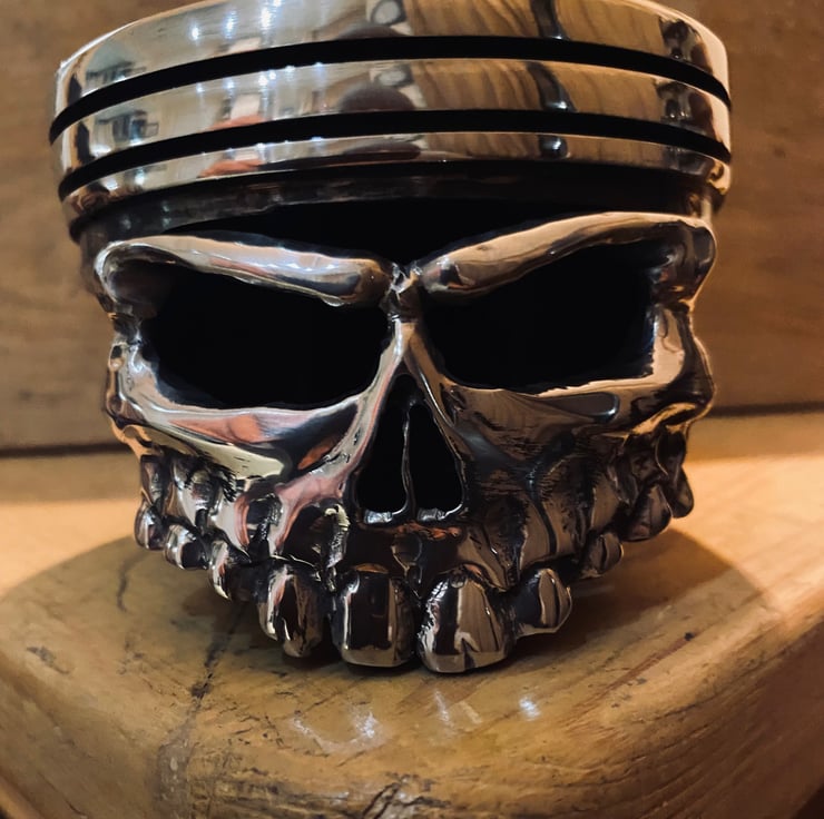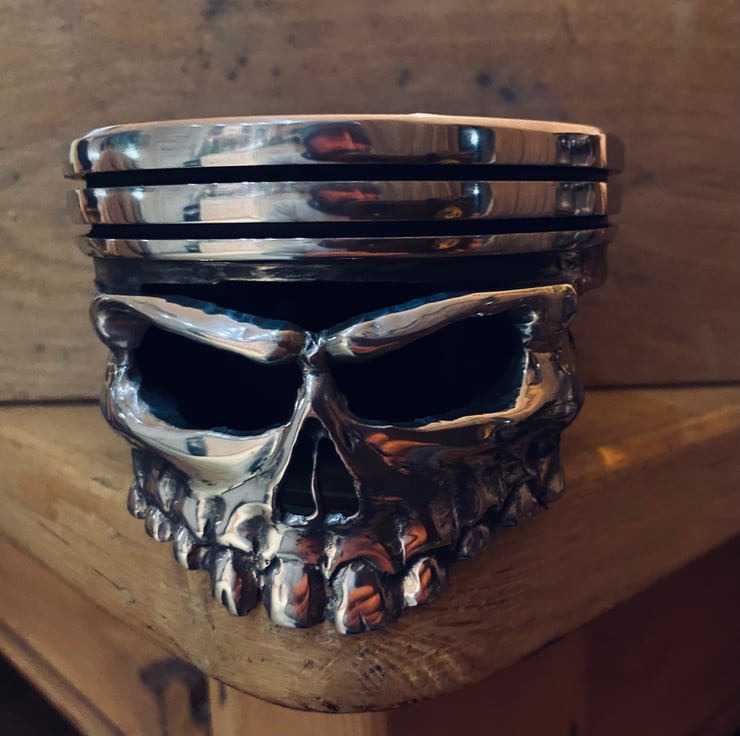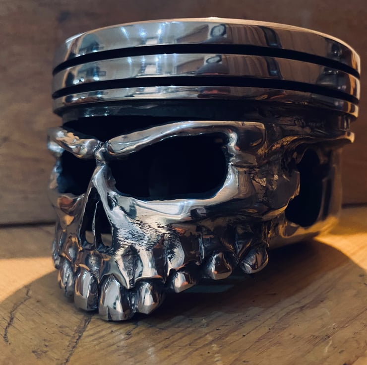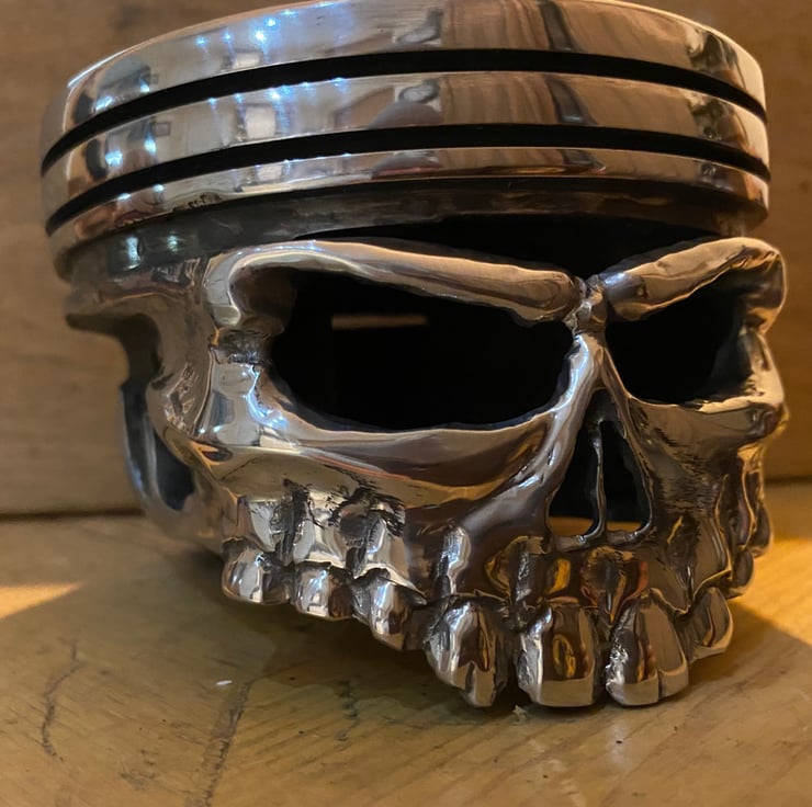 An Original used Chevy chevrolet piston hand carved and polished into a skull pistonface!