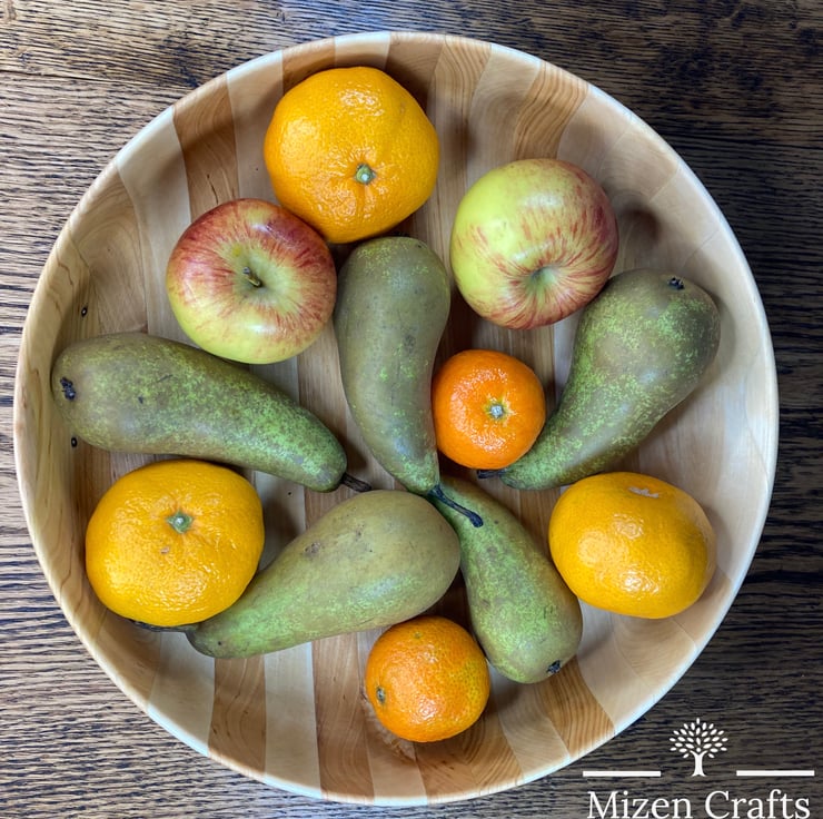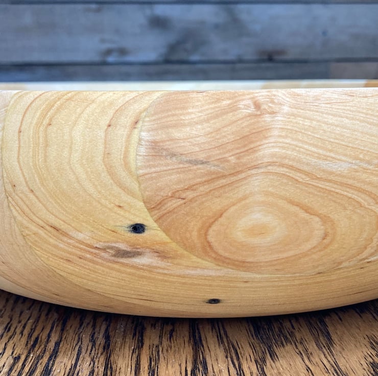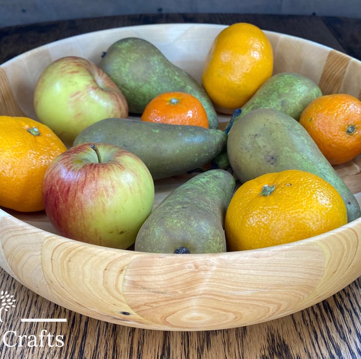 The bowl stands 8cm tall and is 27.5cm wide and is ideal for a fruit bowl. There are some areas visible on the bowl which identifies the previous life of the timber!