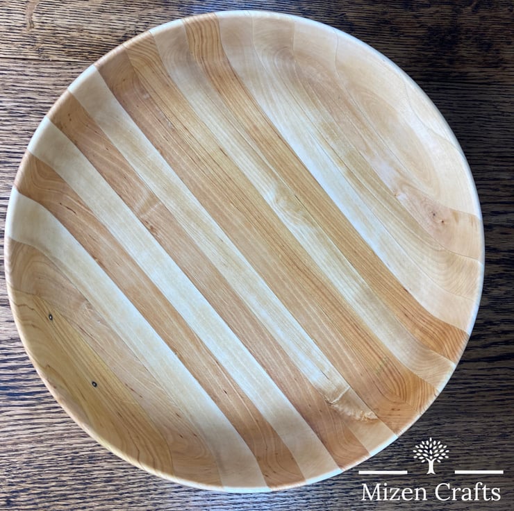 This bowl has been handmade on our lathe. The timber is reclaimed silver birch from a firewood crate. Once stripped down and nails removed, we planed each piece before glueing up to one large piece. This was then 'turned' to shape on our lathe. Once sanded to a fine finish, two coats of food safe oil have been applied.