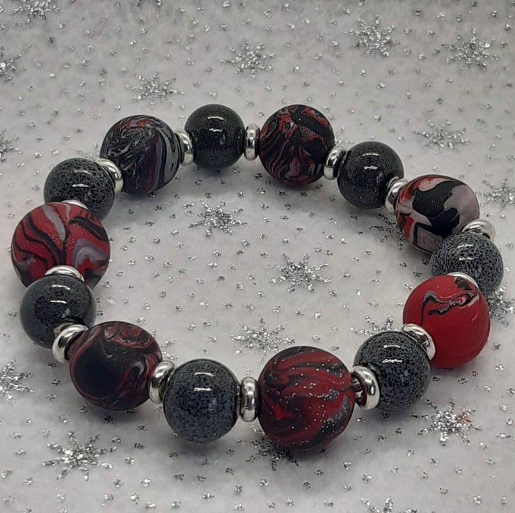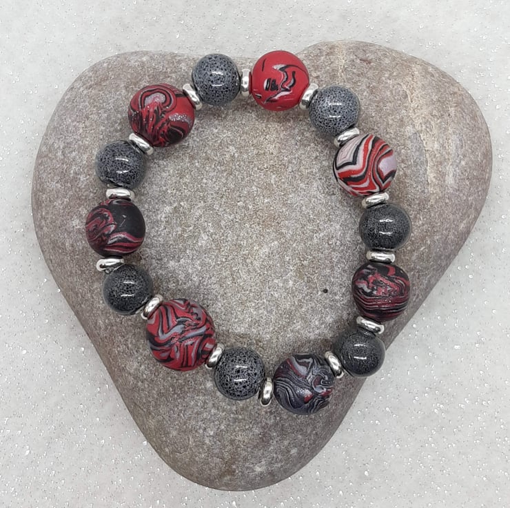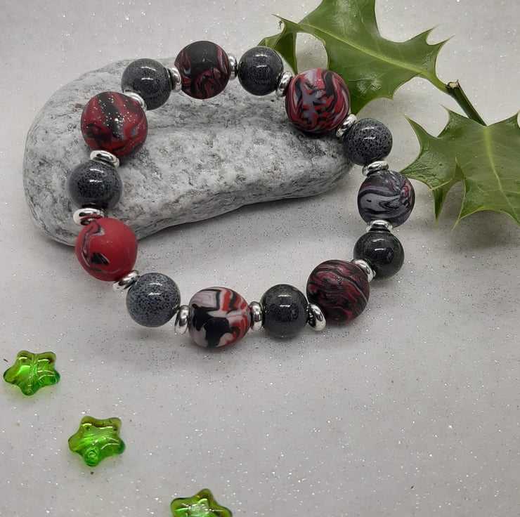 The handmade polymer clay beads measure approx 13mm and are in a a red, black, silver and white swirl design. Between the handmade beads are silver spacer beads and 12mm grey flecked glass rounds.