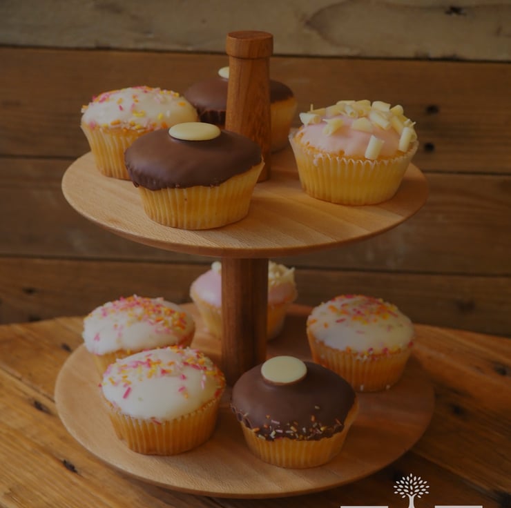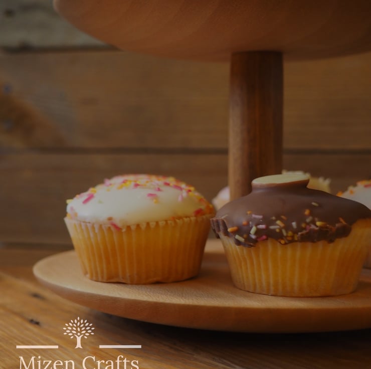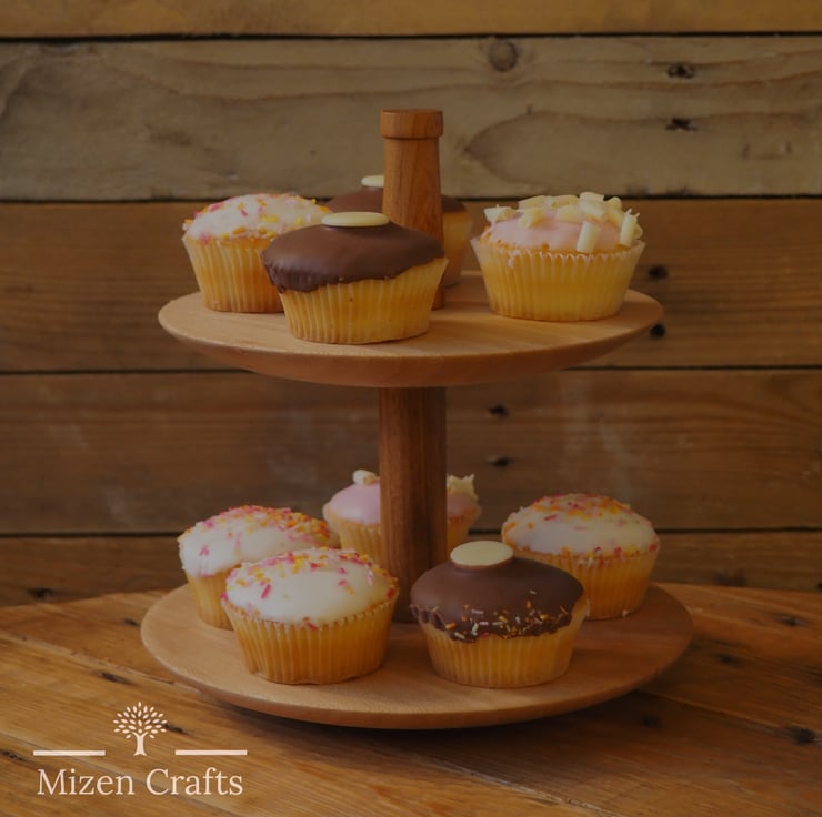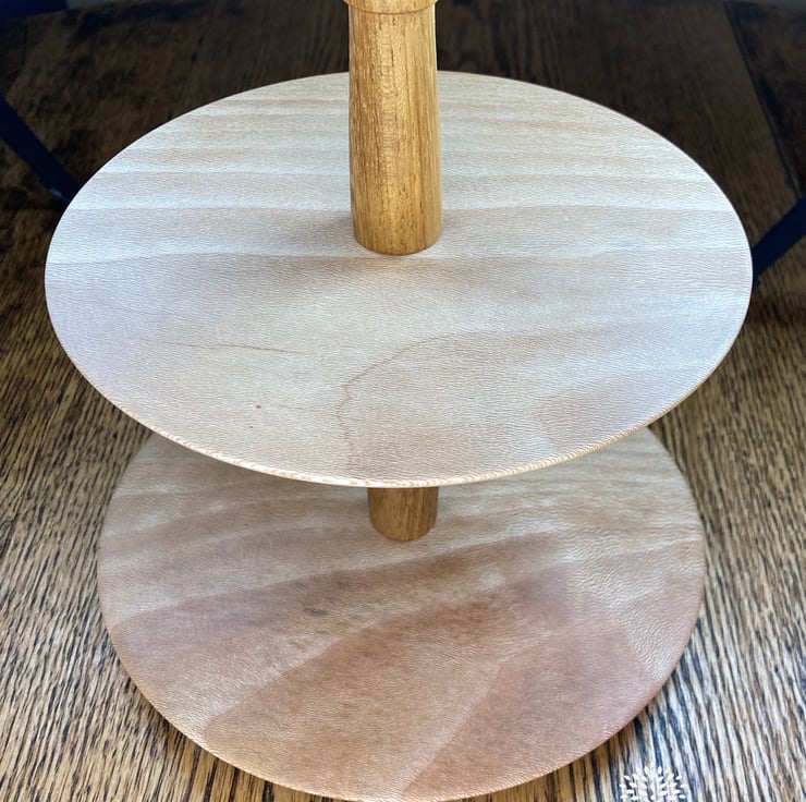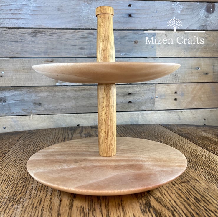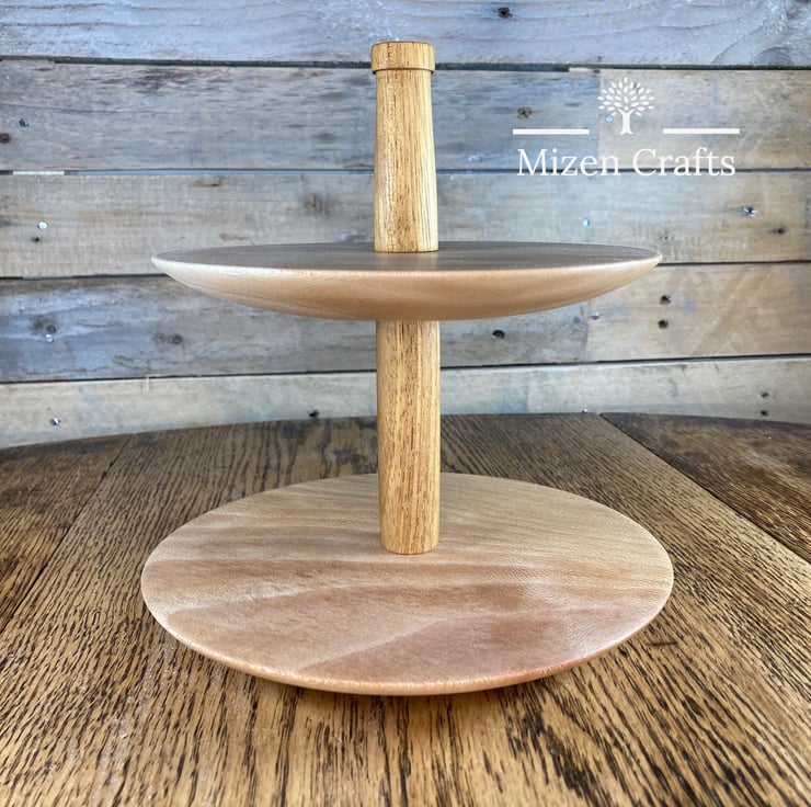 This tiered cake stand has been handmade on our lathe from two pieces of London Plane for the plates and two pieces of Iroko for the spindles. This stands at 21cm tall with the bottom plate being 20cm wide and the top plate 18cm wide.