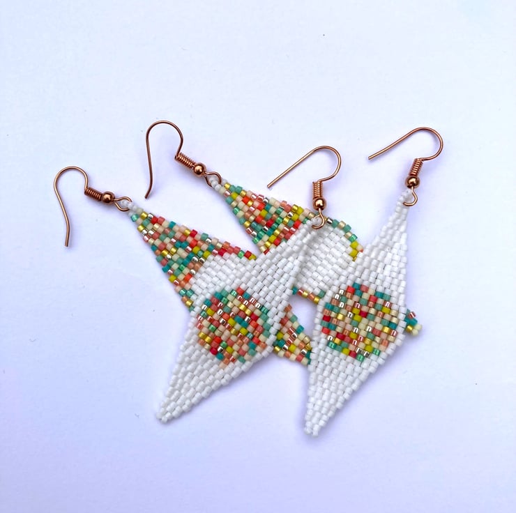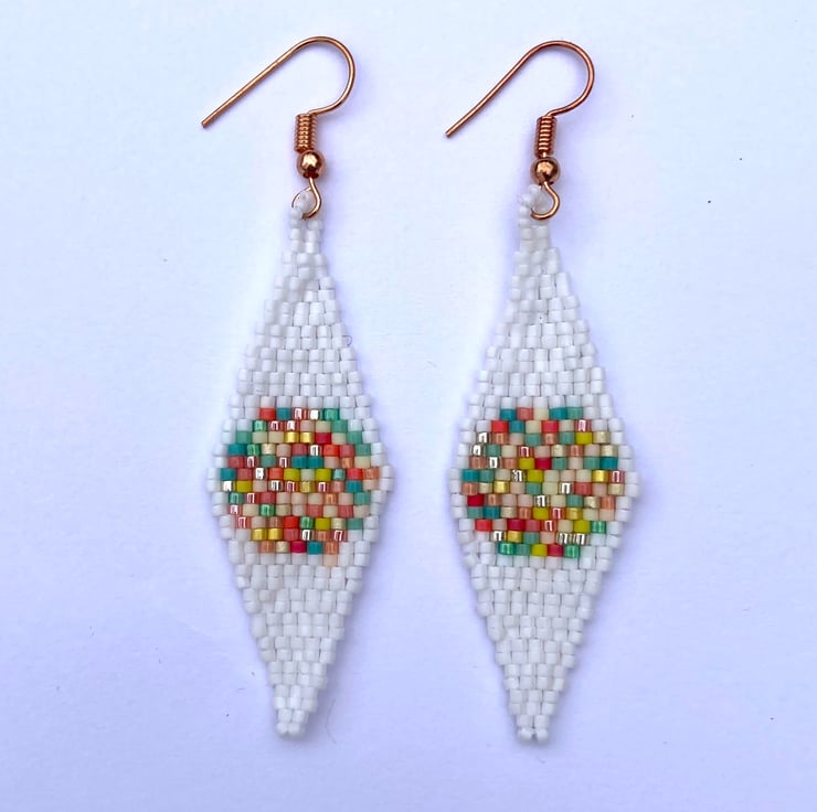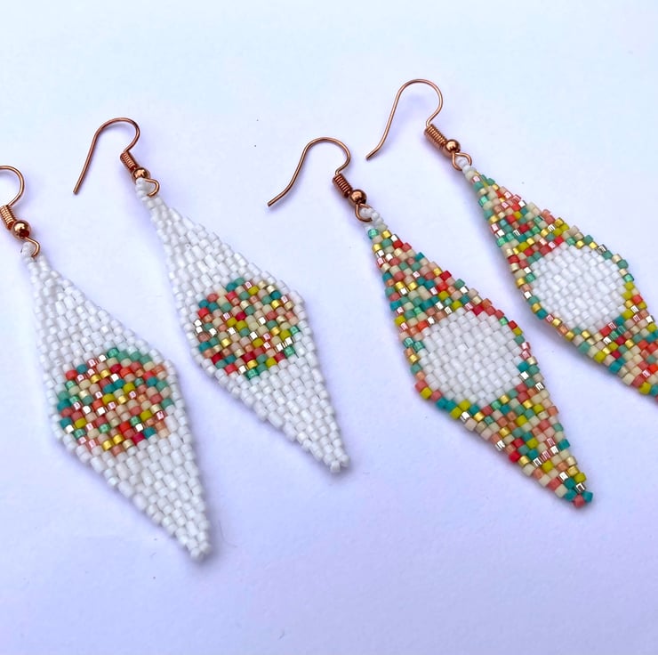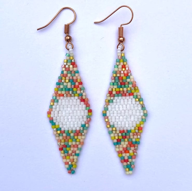 A pair of lovely diamond shaped dangly beadwoven earrings in white and a retro acid pastelly ice creamy multicoloured mix, hand beadwoven by me in two reversed colourways - either a coloured moon on a white background or a white moon on a coloured backgrounc.