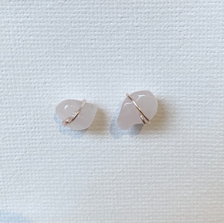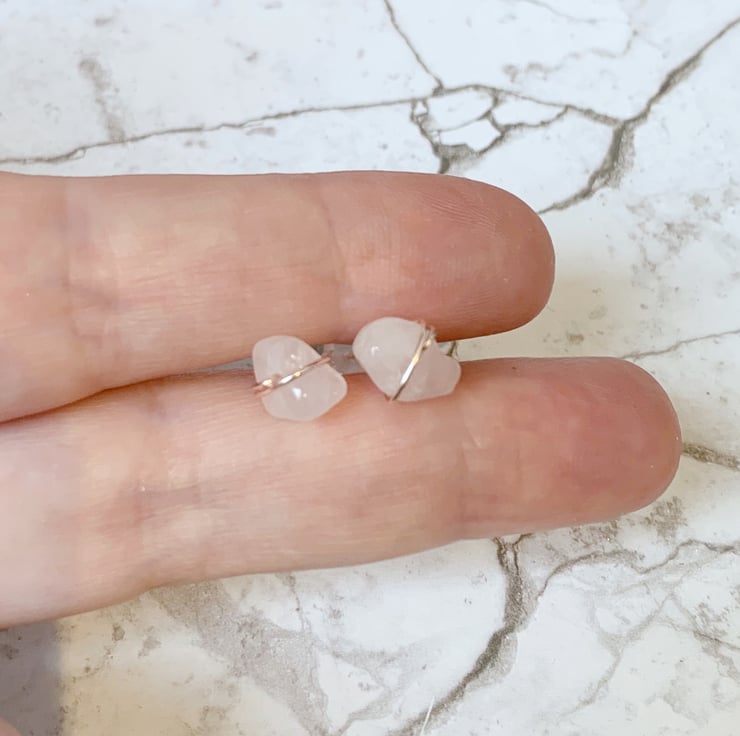 Rose quartz gemstone chip wire wrapped stud earrings in Rose gold coloured copper wire.
