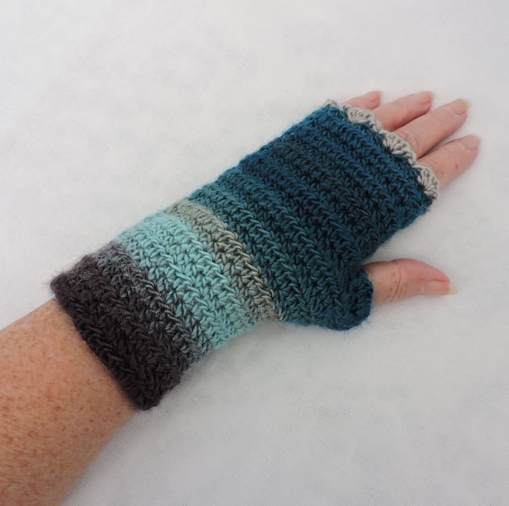 I've crocheted these fingerless mitts using a self striping 100% acrylic double knit yarn. Graduated colours of teal, turquoise, pale grey, dark grey and aqua. They have a pale grey wavy edged top and a plain body. A stylish winter warmer.