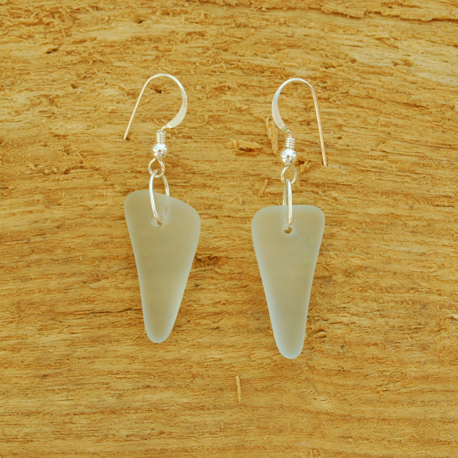 We've made these pretty earrings from two pieces of well-matched beach glass. The tumbled glass is finely frosted and picks up the light beautifully. It is the pale aquamarine colour of old bottles, which were made in this colour because white glass was too expensive. The earrings are mounted on sterling silver ear wires.