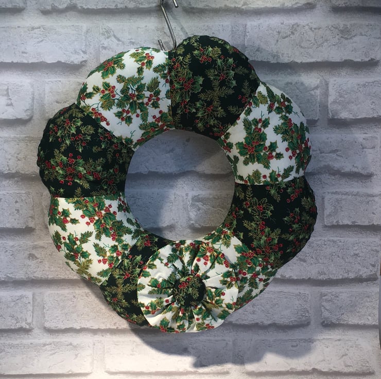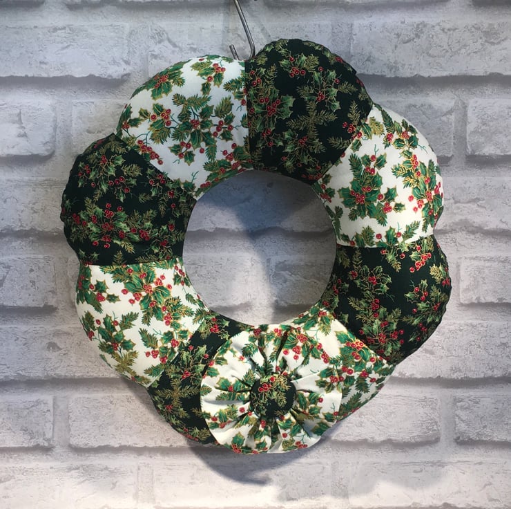 I have this lovely festive padded fabric wreath available. It's made from green holly print cotton fabric and a contrasting white holly print. At the bottom on the front I've also added this large gathered bow in the green fabric and a cover button. I've used toy wadding for the padding