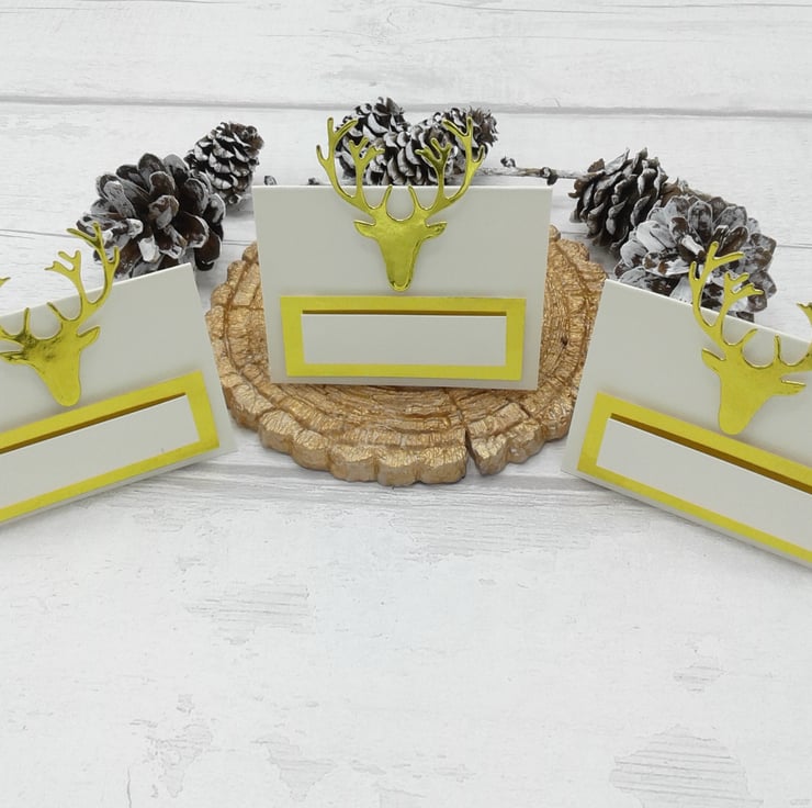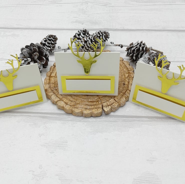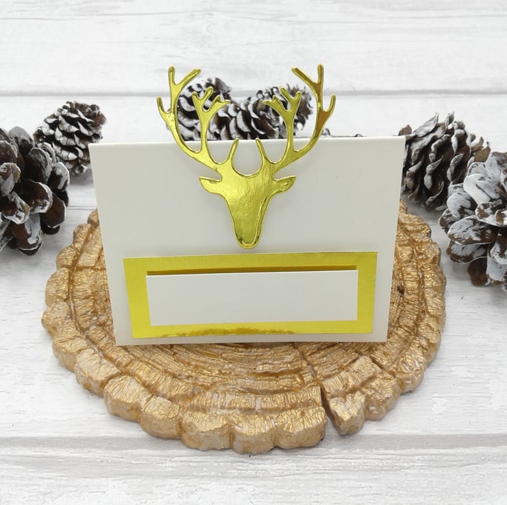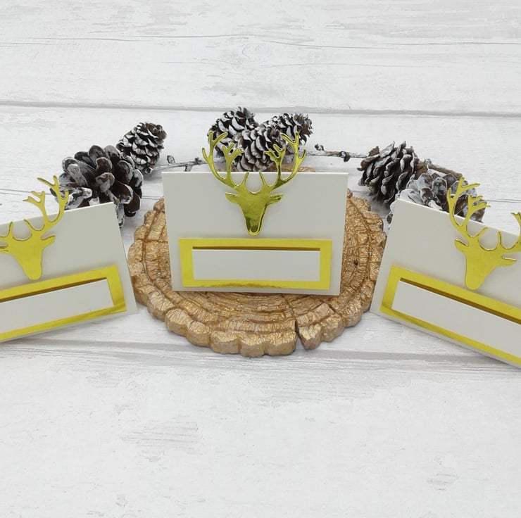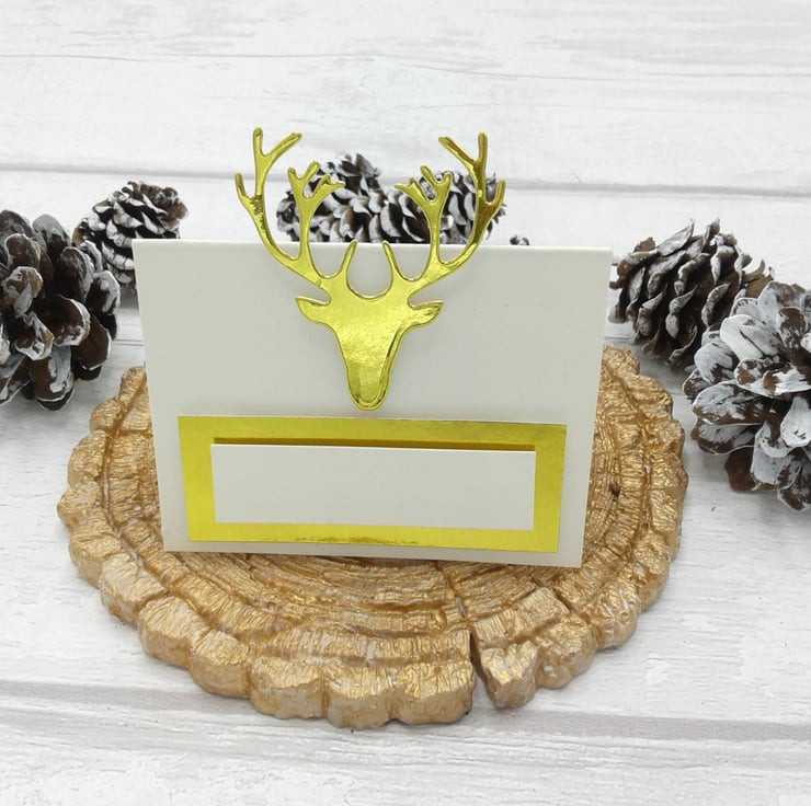 Comprising of ivory place cards, gold stag head and gold and ivory name space.