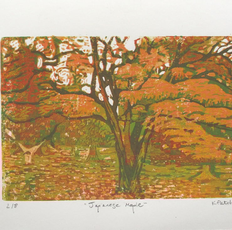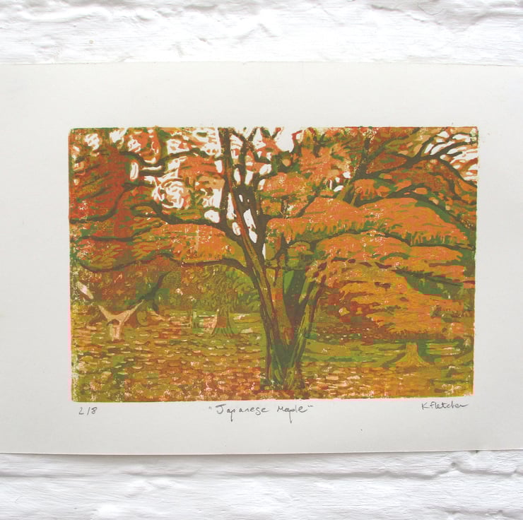 This original linocut print brings a little autumn colour into your home, office, or anywhere you would like a relaxing, colourful work of art. It shows a beautiful Japanese Maple tree in its autumn glory.