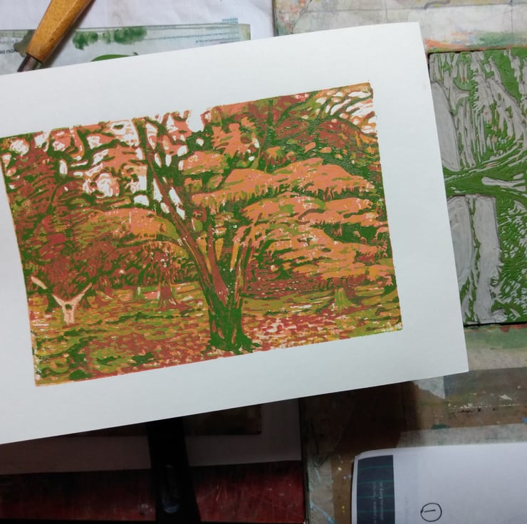 I based this reduction linocut print on photo's I took during a visit to the wonderful Westonbirt National Arboretum during the month of October. I pressed the print in 7 pressings. My attempt to capture a little of that autumn wonder.