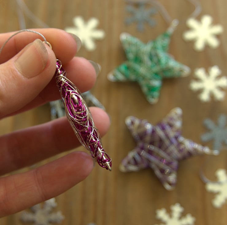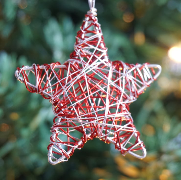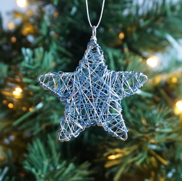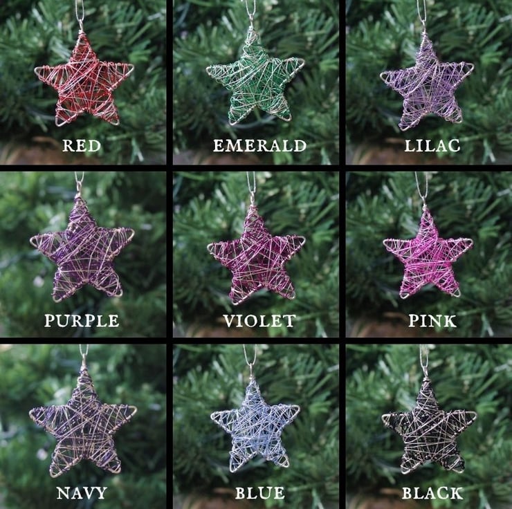 These cute little stars are available in a choice of colours to match your Christmas colour scheme. The shiny metallic wire is beautiful and bright but a bit tricky to photograph - please review all of the photos to see them under different lighting. The stars measure approx. 5cm point to point and just under 1cm thick. They each come with a silver string loop ready for hanging.