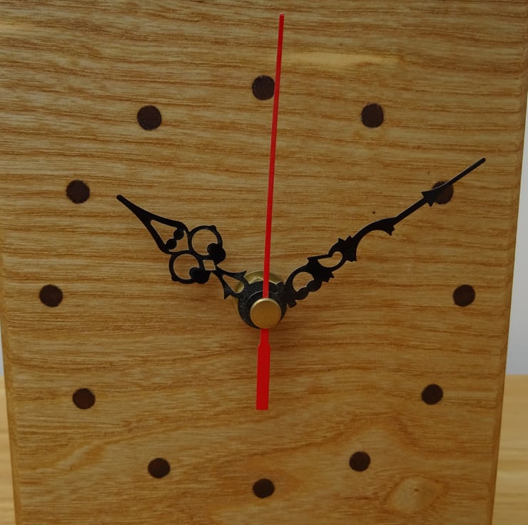 It is made from a piece of waney edge ash. The clock face is made from contrasting dots of black walnut.