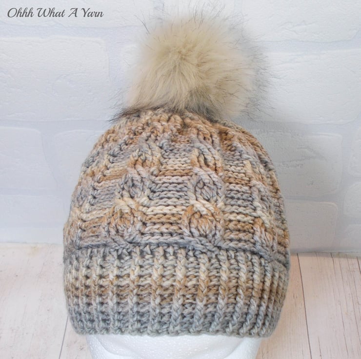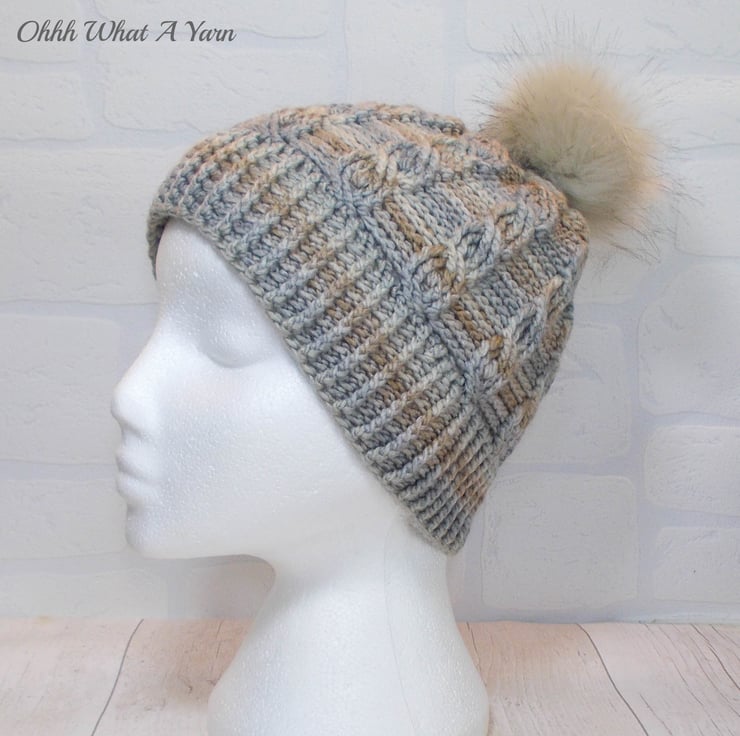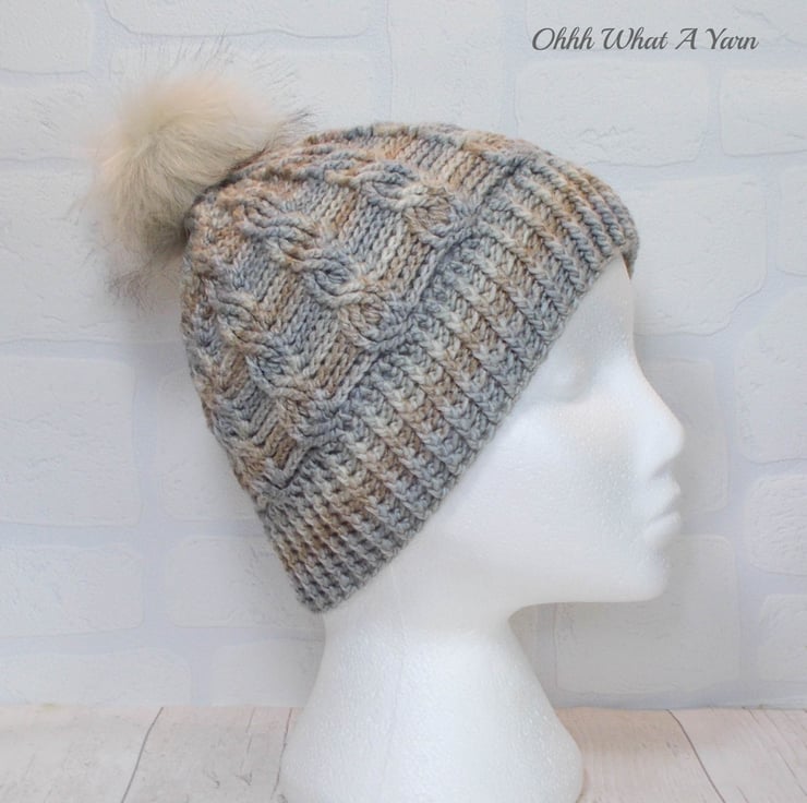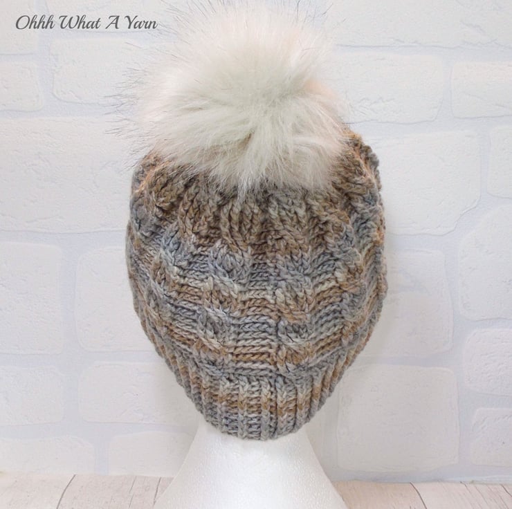 They have a gorgeous cable and bobble pattern and a ribbed edging, and I have added a faux fur pom pom to each one.