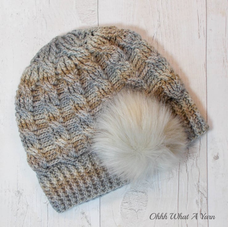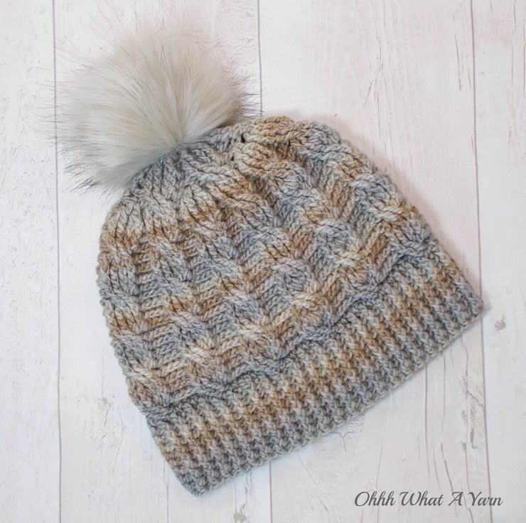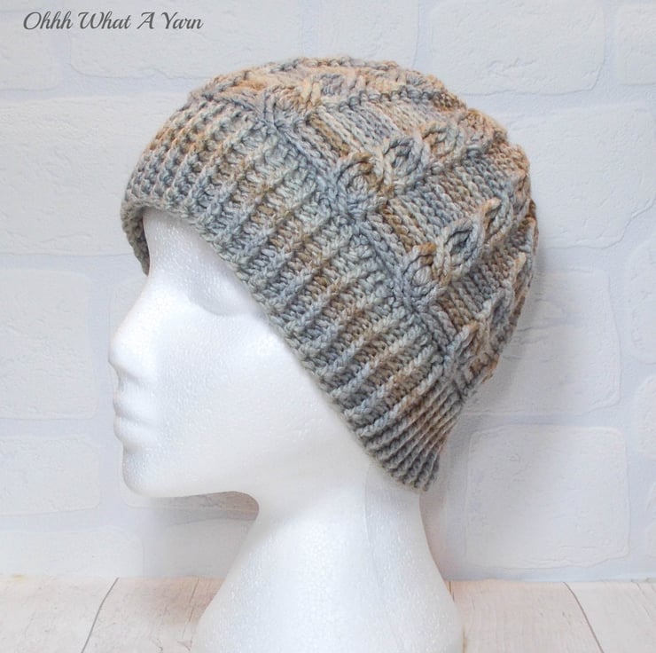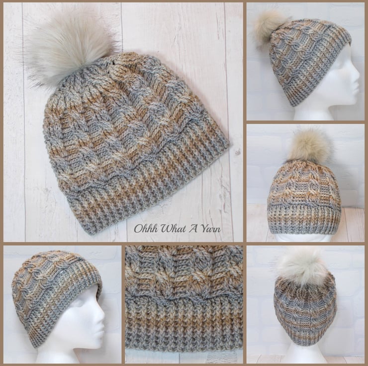 This cosy cable hat is crocheted using gorgeous colour changing 100% acrylic yarns in natural colours of taupe, beige and cream.