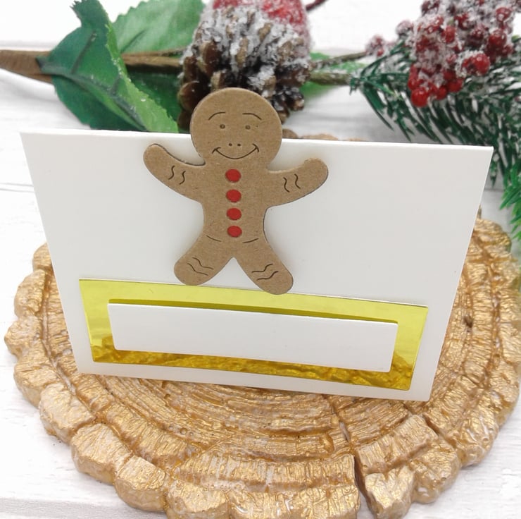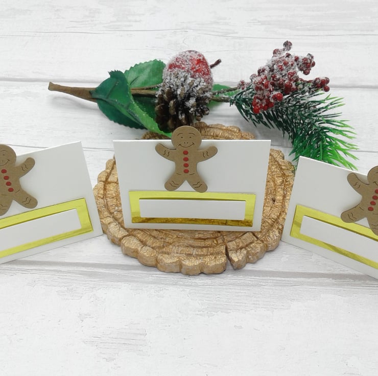 This is a set of 10 ivory place cards, decorated with gold and ivory name spaces and a super cute gingerbread man.