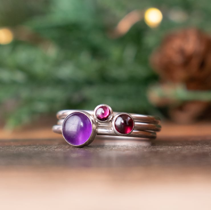 A set of three handmade sterling silver stacking rings with the rich and festive jewel tones of Amethyst and pink Garnet. As they are separate rings, you can choose to wear on their own, or in any combination as you prefer.