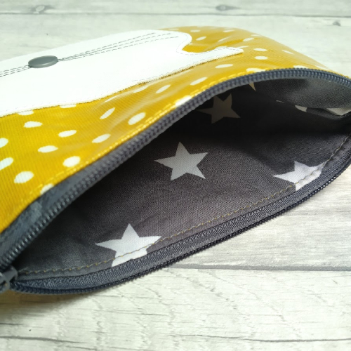 It is made from mustard yellow pvc coated cotton (oilcloth) with a stylised white cat appliqued on the front. A star print grey cotton lining completes the look!