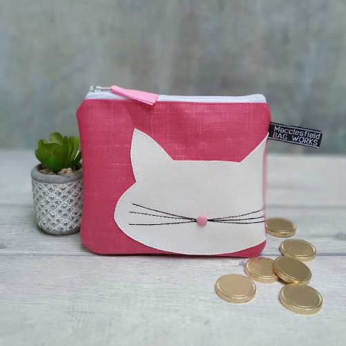 It is made from vibrant pink pvc coated cotton (oilcloth) with a stylised white cat appliqued on the front. A quirky cat print grey cotton lining completes the cat-tastic look!