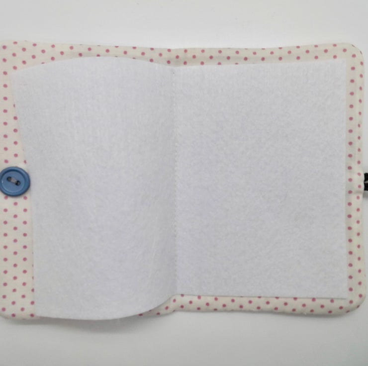 Lined with a pink and white dotty fabric and interlined with a layer of fusible fleece.