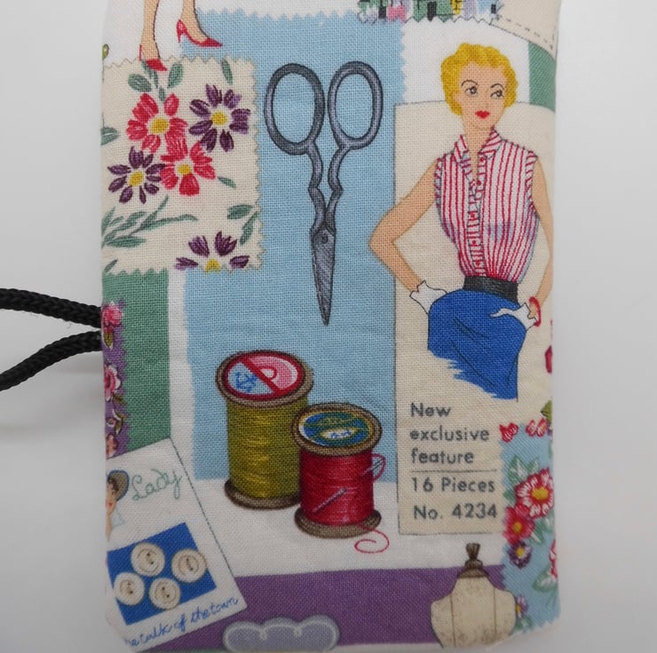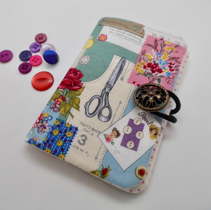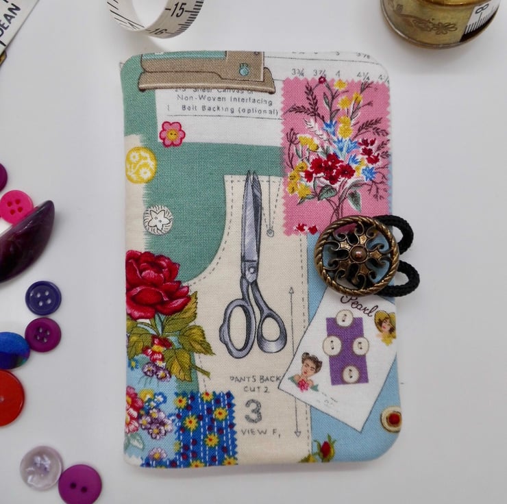 I've used a quality quilting cotton with a vintage style dressmaking theme to make this needle case, useful to keep your sewing needles neat and close at hand.